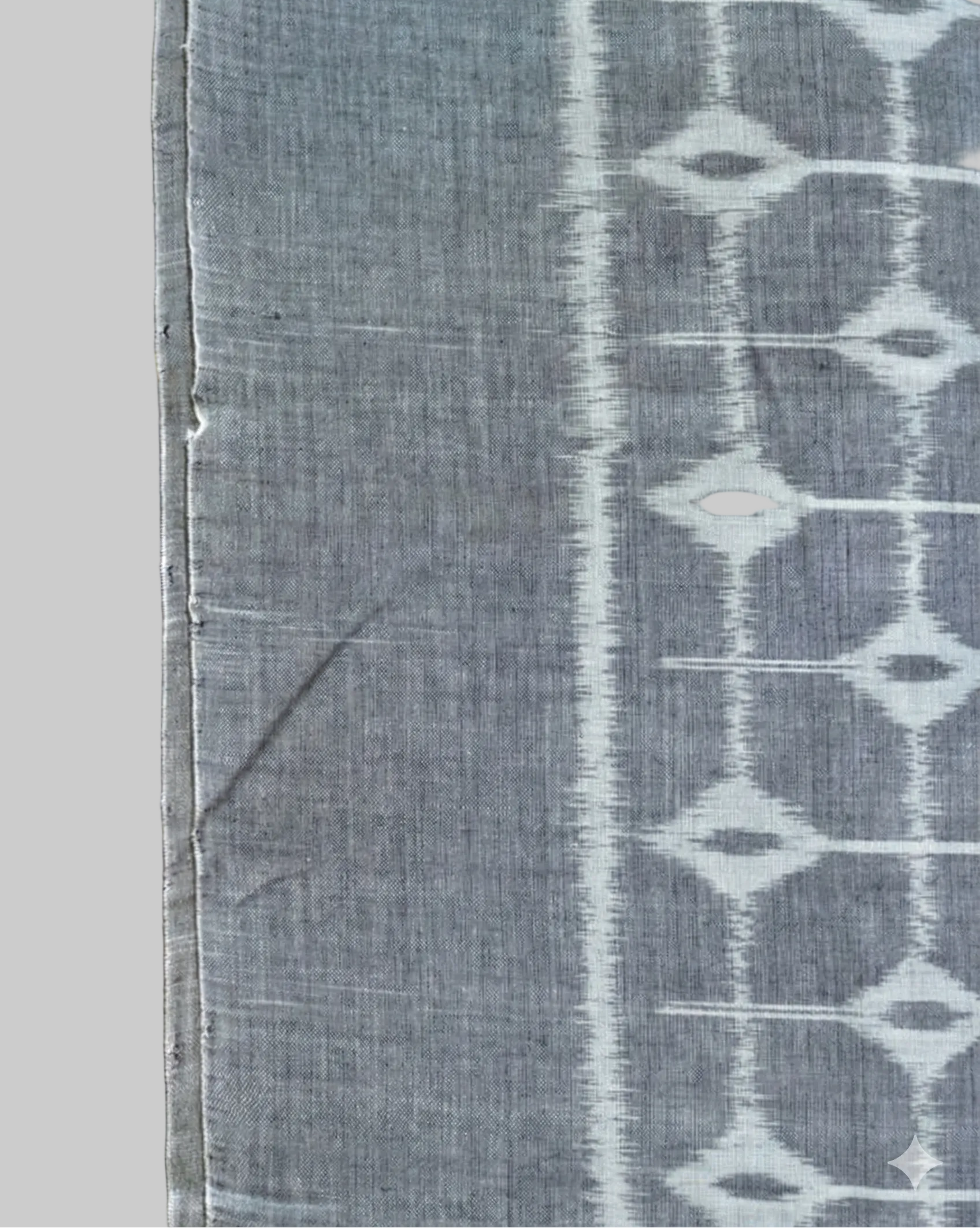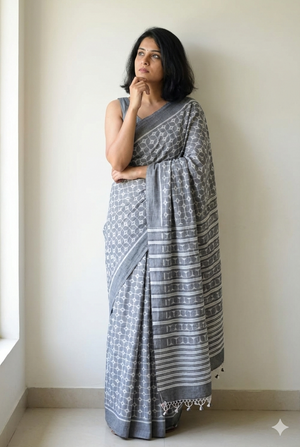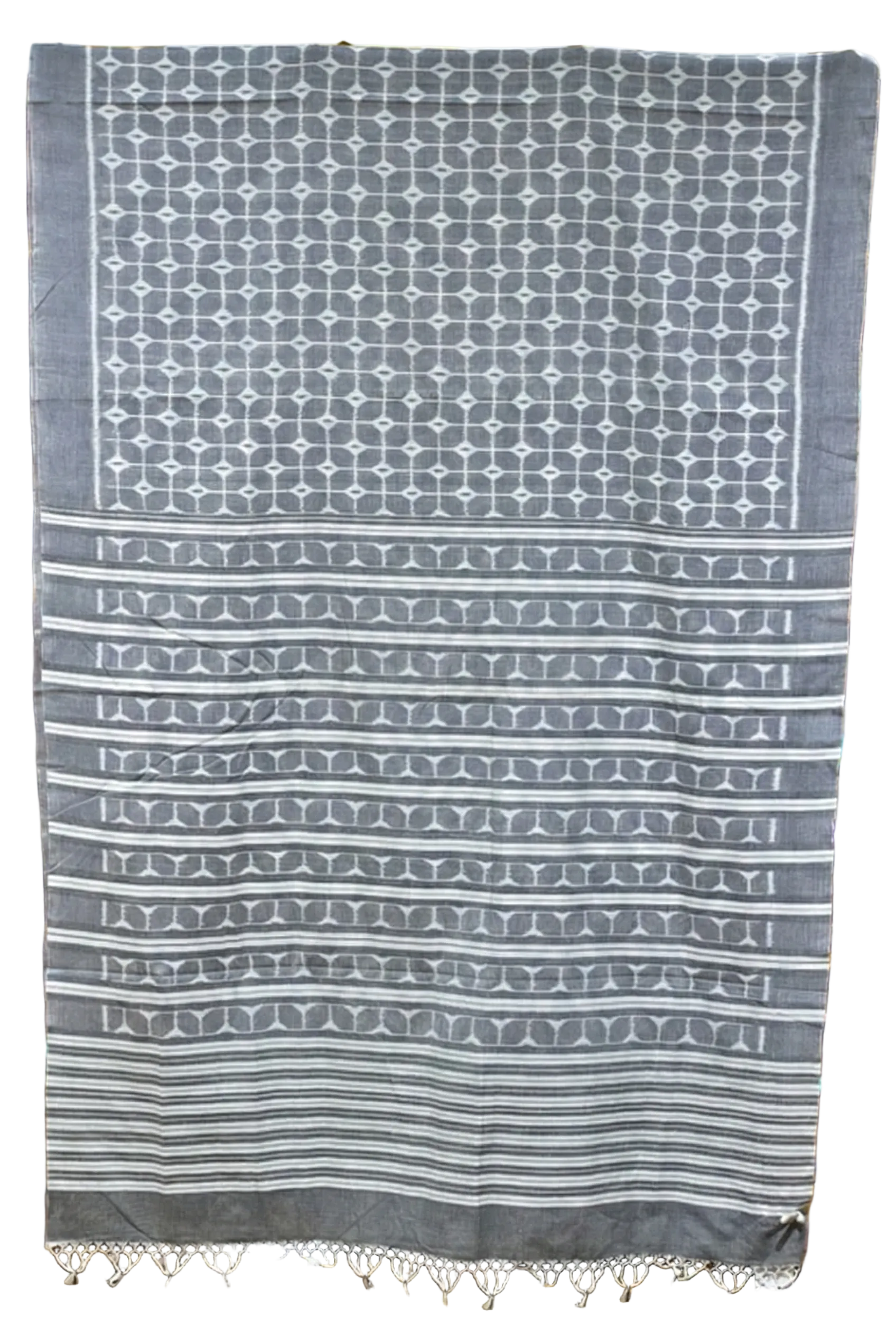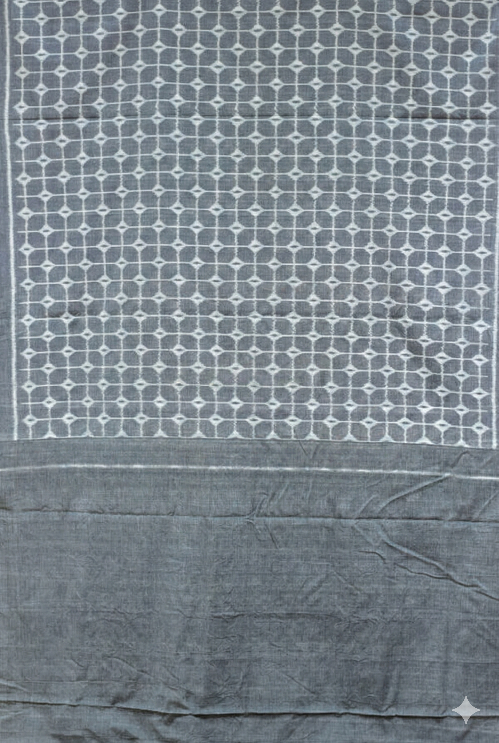 Border: The border is an extension of the body's geometric pattern, defined and framed by crisp white stripes that run along the saree's edges, finishing with a solid grey selvedge.