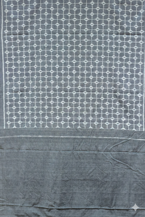 Body: The main body of the saree is a pleasing grey color, covered entirely with an intricate, repeating geometric pattern in white, known as the "Chessboard Thikiri" design.