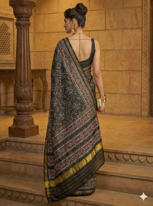 This Patola silk saree is a stunning representation of Gujarat’s weaving heritage, known for its intricate ikat patterns and luxurious silk texture. The saree features: