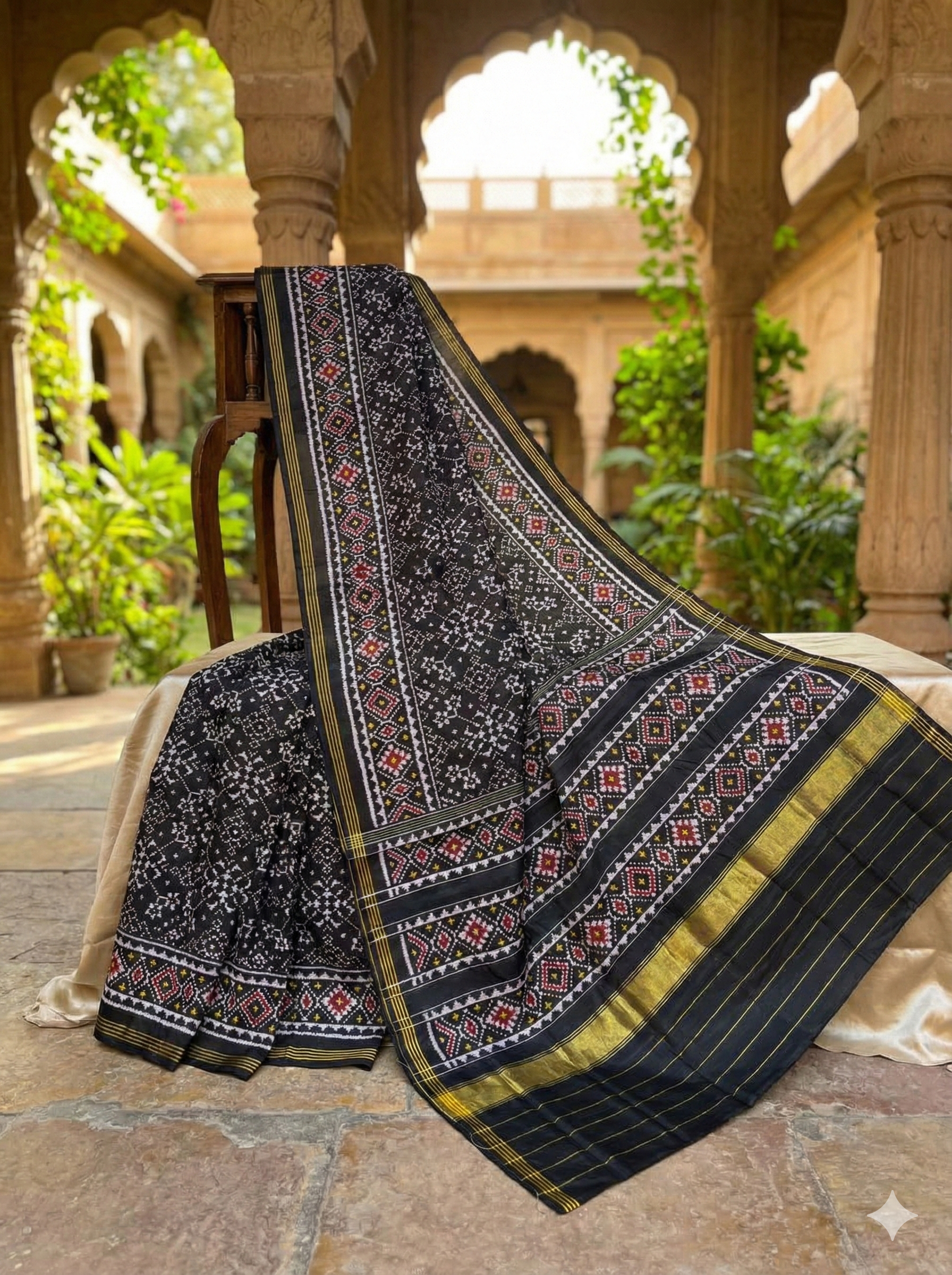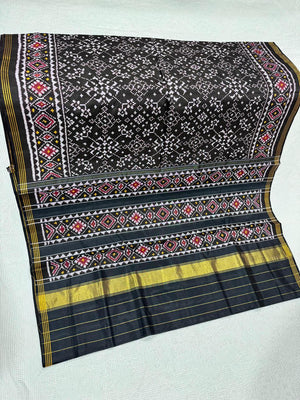 Black & Gold - Traditional Patola Silk Saree with Single Ikat-Inspired Design