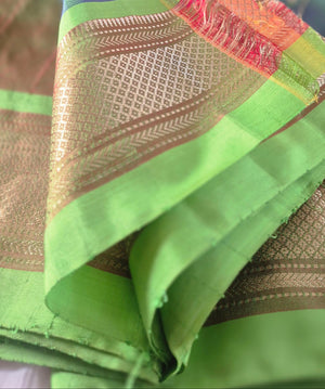 - Pallu: Golden–Copper with multicolor motifs (pink, purple, blue, green, red)