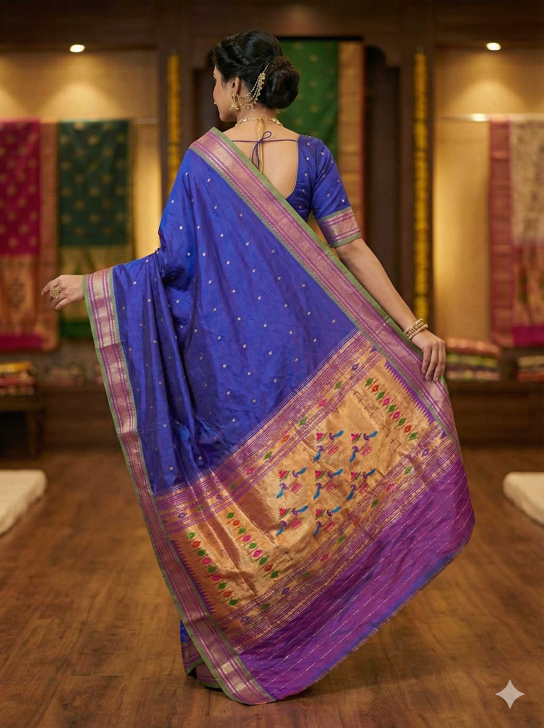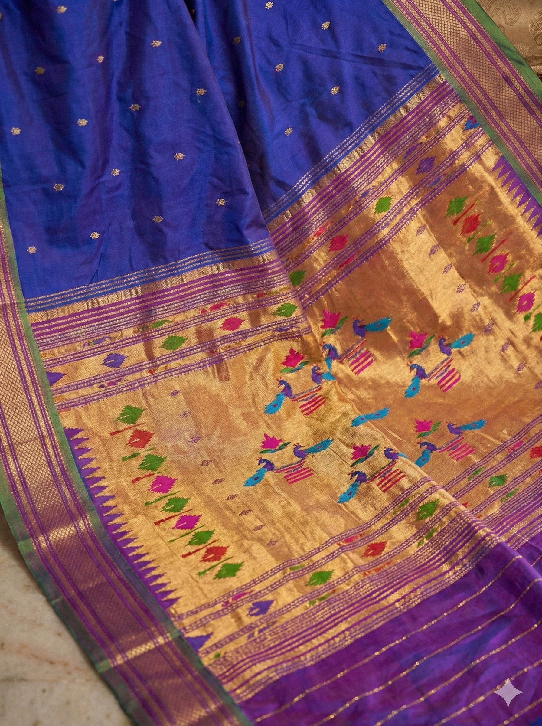 Paithani is handwoven using pure silk and zari (gold or silver threads). The hallmark of Paithani is its intricate pallu and border, featuring motifs like peacocks, lotuses, and geometric patterns. The weaving technique is tapestry style, where each motif is woven by hand, making every saree unique and a true work of art.