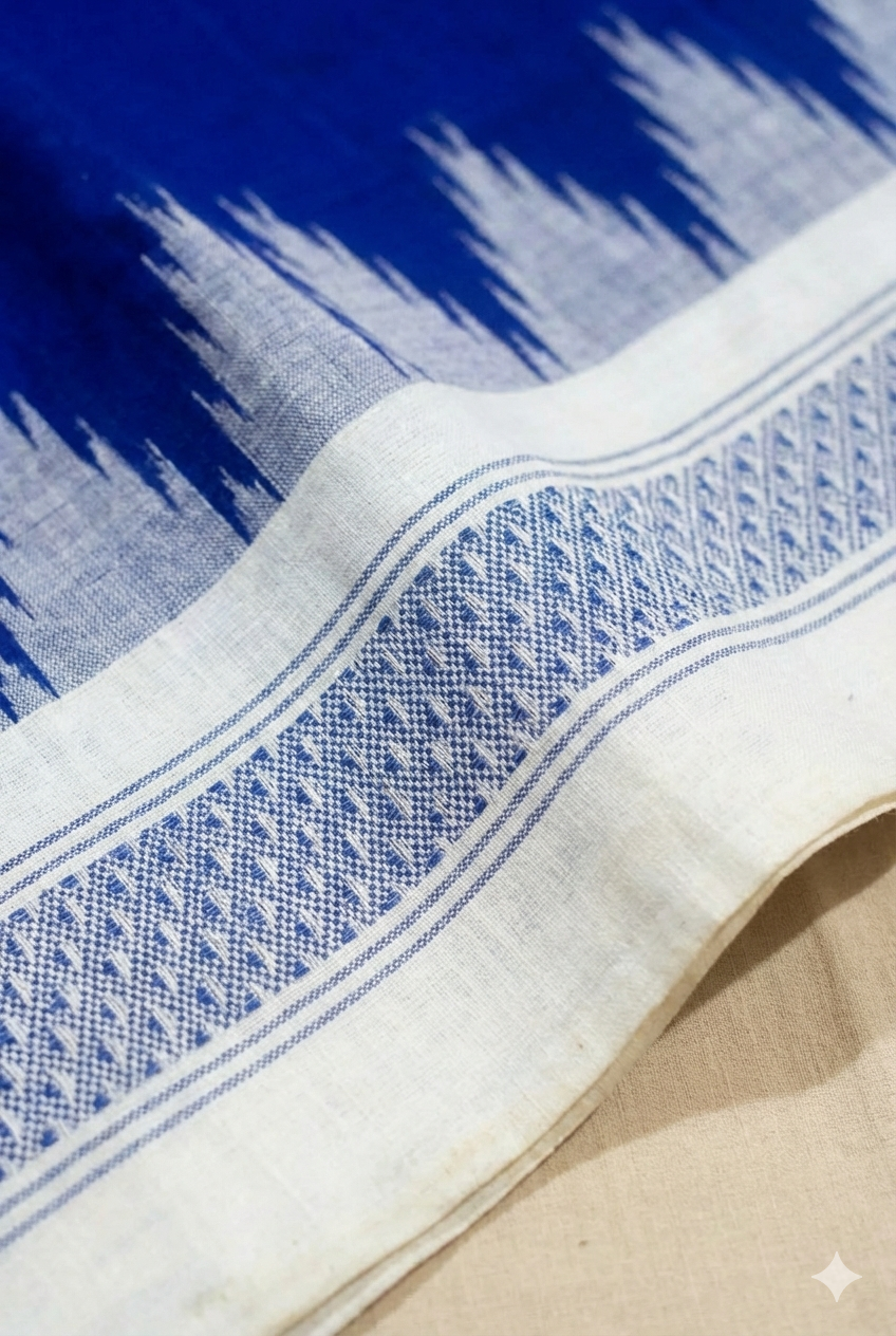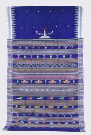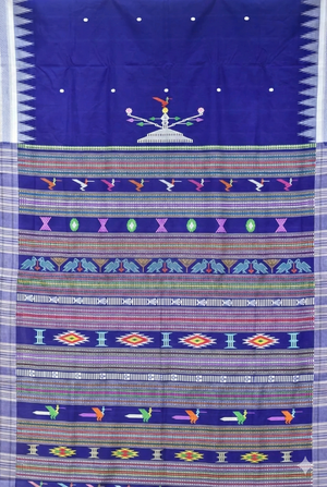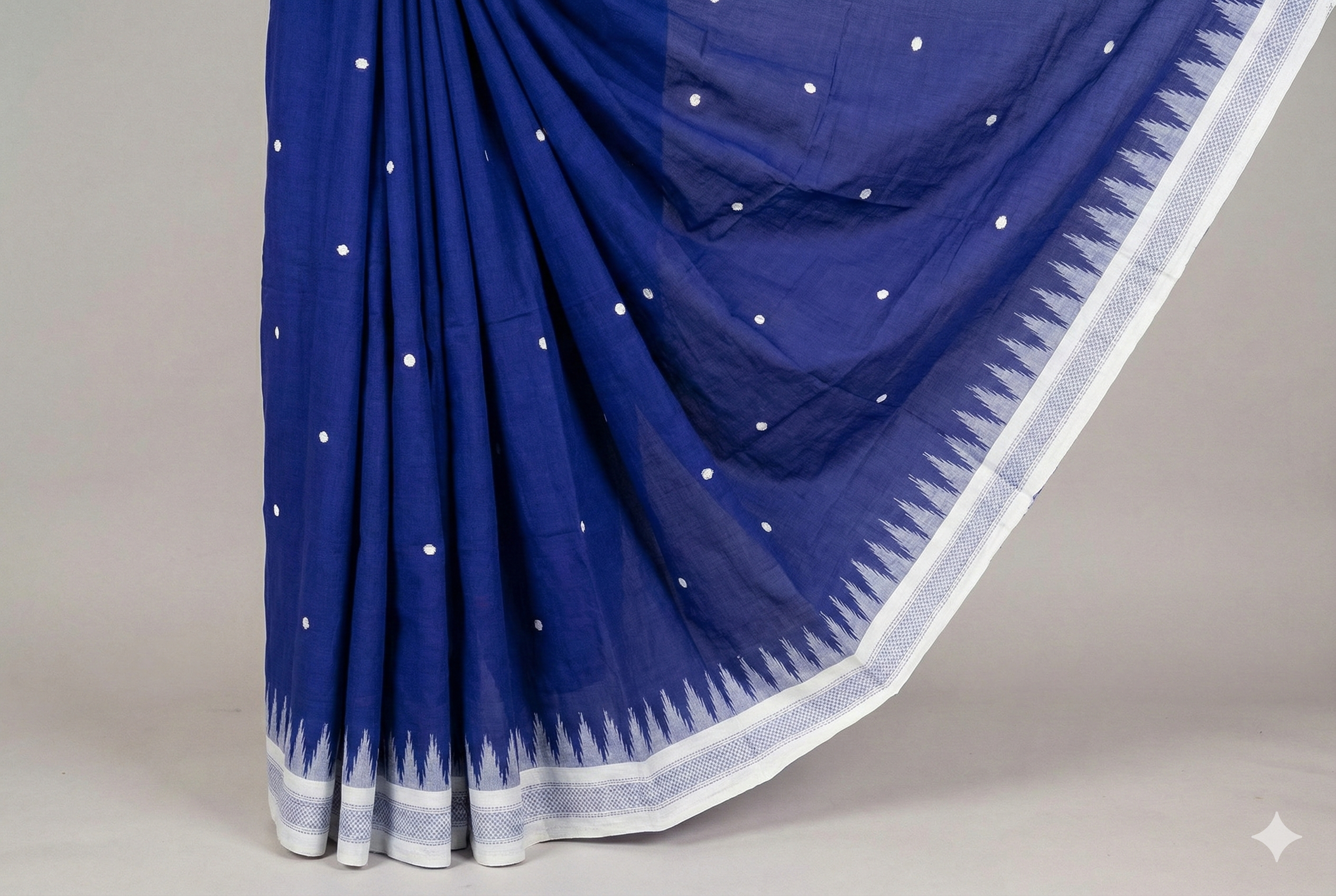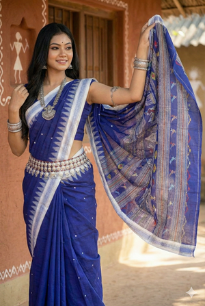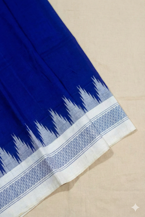 Ganjam Bomkai Cotton Saree - Deep Blue with White Temple Border & Polka Dots | Odisha Handloom Saree