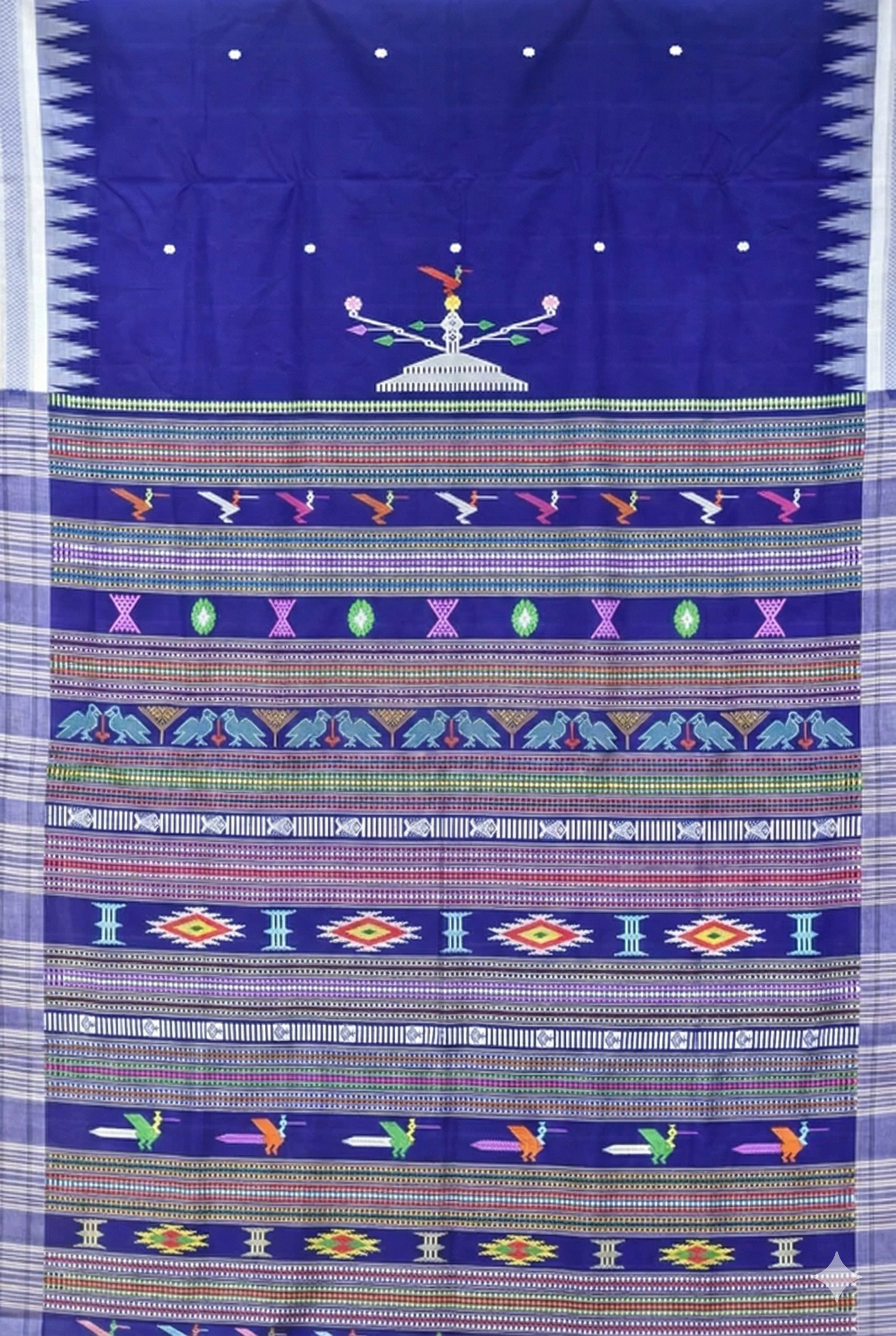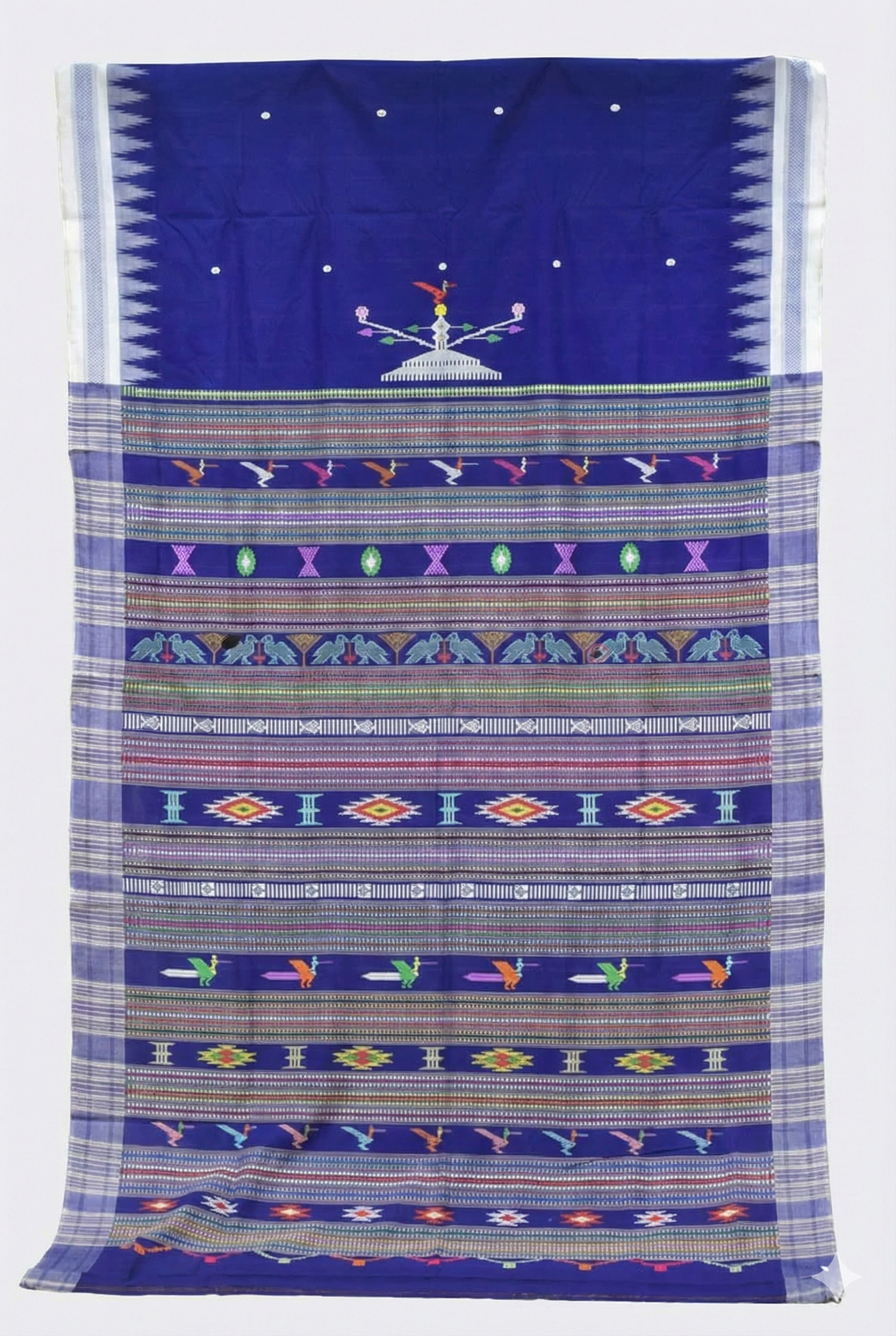 Lower Pallu: Below the central motif, the pallu consists of numerous densely woven horizontal bands featuring traditional motifs in various colors. These bands include rows of flying birds, geometric "X" and diamond shapes, pairs of peacocks facing each other, fish motifs, and larger, complex multi-colored geometric diamond patterns.