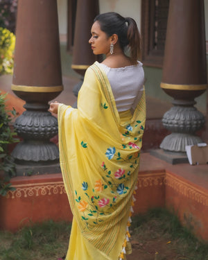 The base of the saree is a vibrant, sunshine yellow Mul cotton, known for its sheer, soft, and breathable texture.