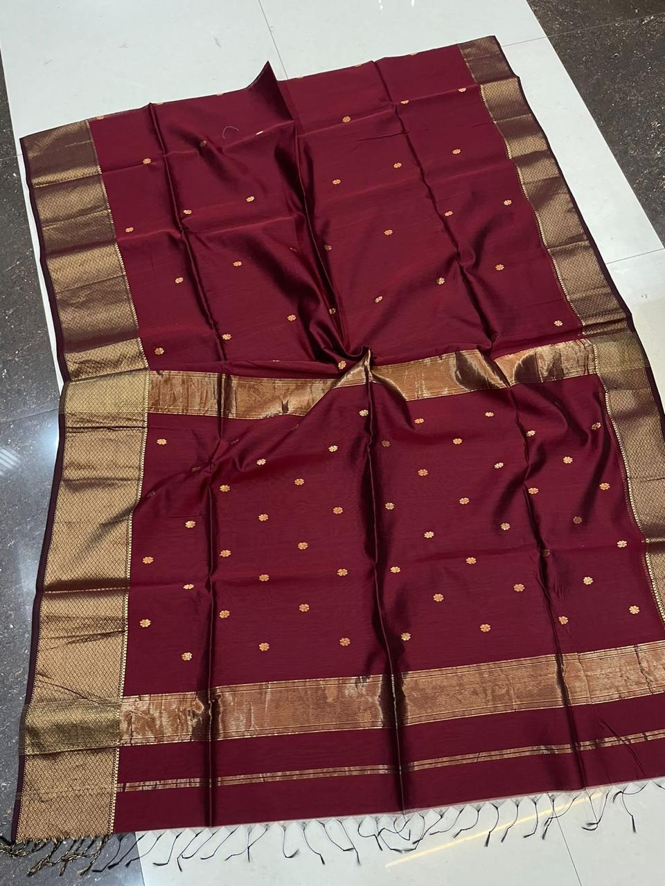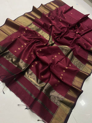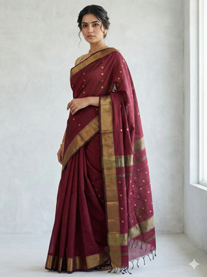Deep Maroon Handloom Maheshwari Silk Cotton Saree with Gold Zari Butta