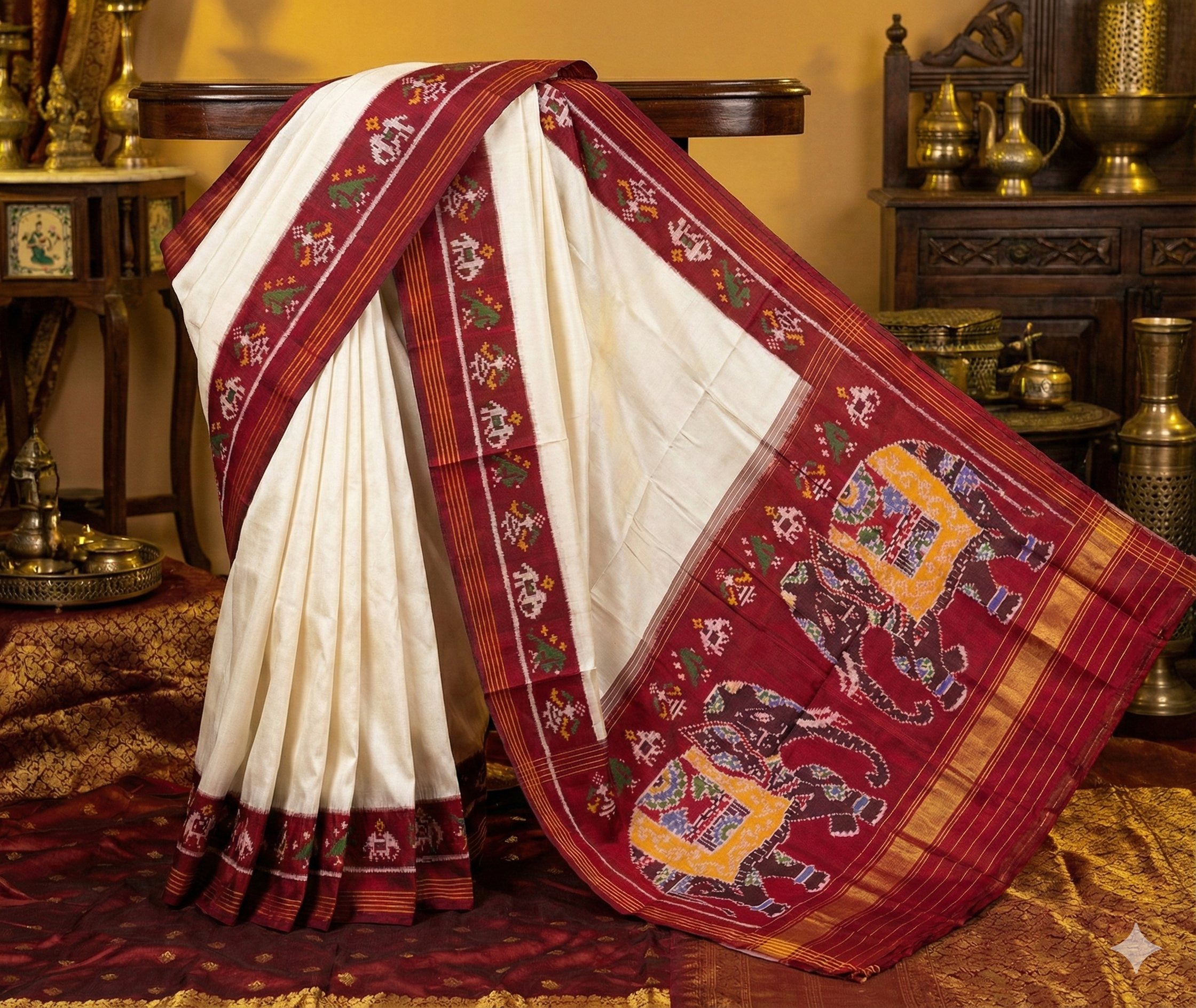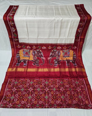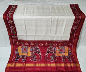 - Design: Vibrant maroon pallu featuring double elephant motifs in multicolor with intricate semi-ikat detailing.