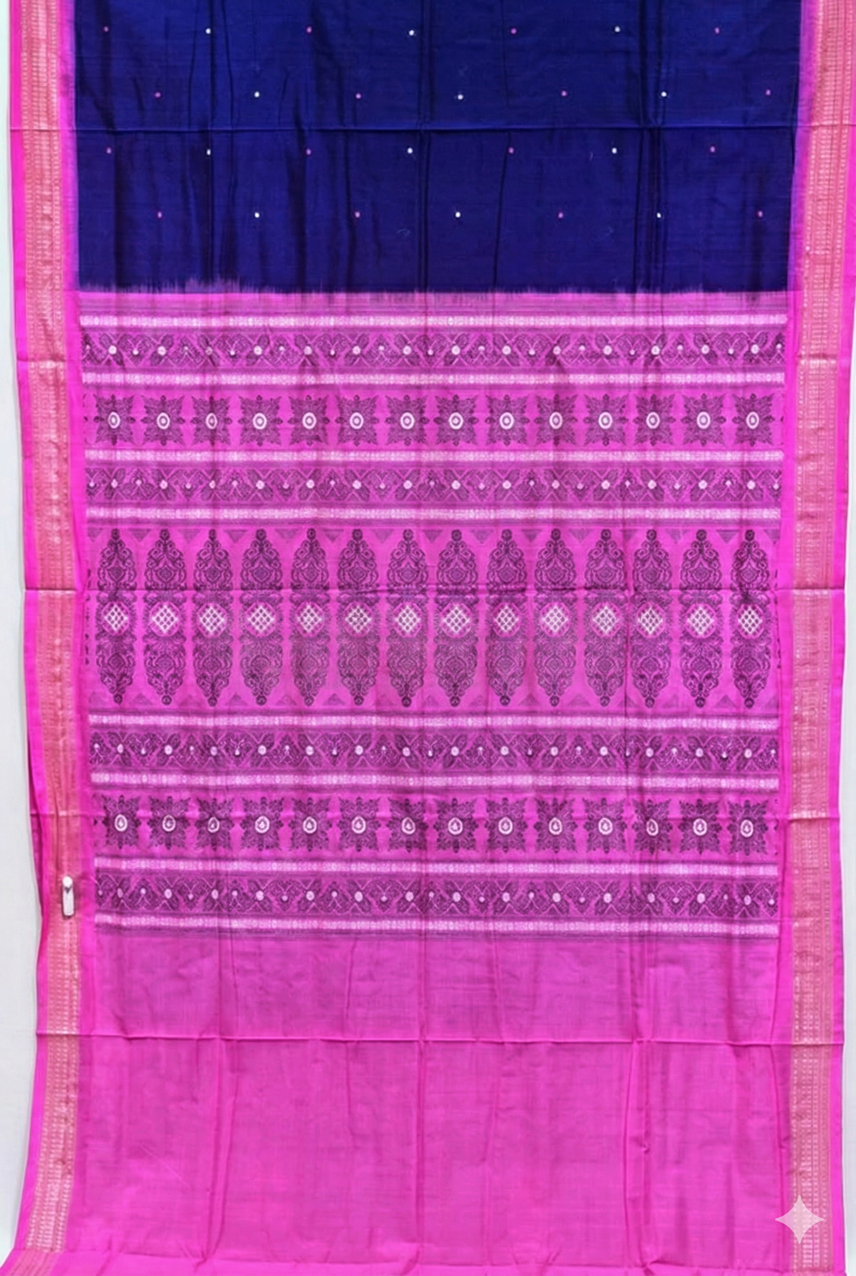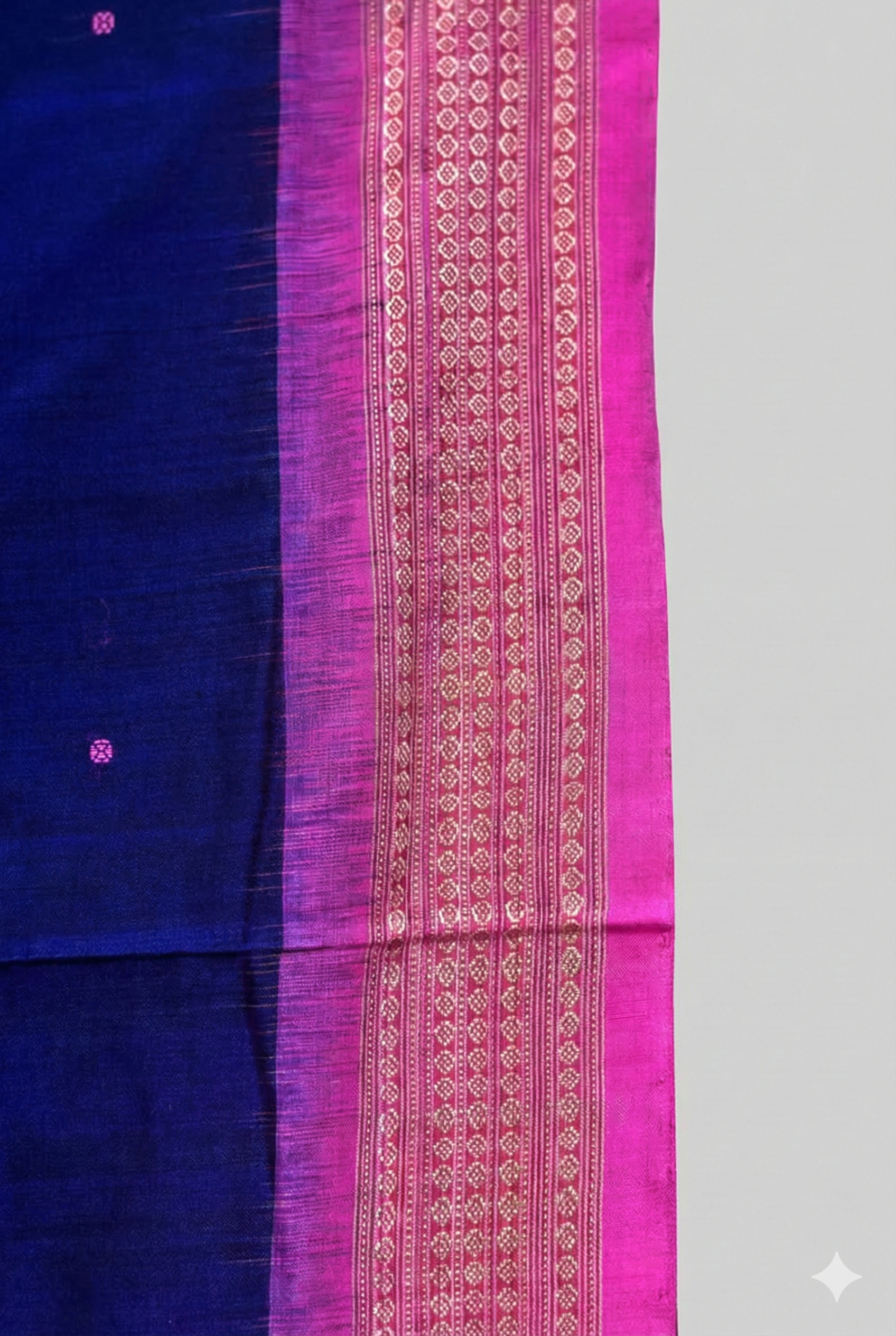 - Contrasting pink cotton border woven with classic Bomkai patterns