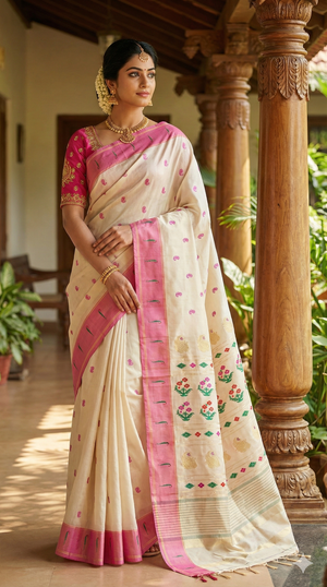 Paithani is handwoven using pure silk and zari (gold or silver threads). The hallmark of Paithani is its intricate pallu and border, featuring motifs like peacocks, lotuses, and geometric patterns. The weaving technique is tapestry style, where each motif is woven by hand, making every saree unique and a true work of art.