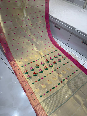 Premium Brocade Tissue Silk Paithani Saree with Rani Pink Zari Border & Multicolor Floral Pallu – Traditional Maharashtrian Handloom