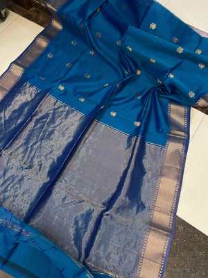 Embrace traditional elegance with this stunning light blue saree, perfect for weddings, festivals, and special occasions. Crafted from a lustrous silk-blend fabric, this saree drapes beautifully and offers a regal feel. The light blue body is dotted with delicate golden zari buttas, adding a subtle sparkle. It is framed by a magnificent, wide golden zari border featuring intricate geometric patterns. The pallu is a true statement piece, adorned with opulent, parallel golden zari stripes that create a luxurious finish. This saree is a timeless addition to any ethnic wardrobe.