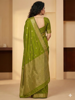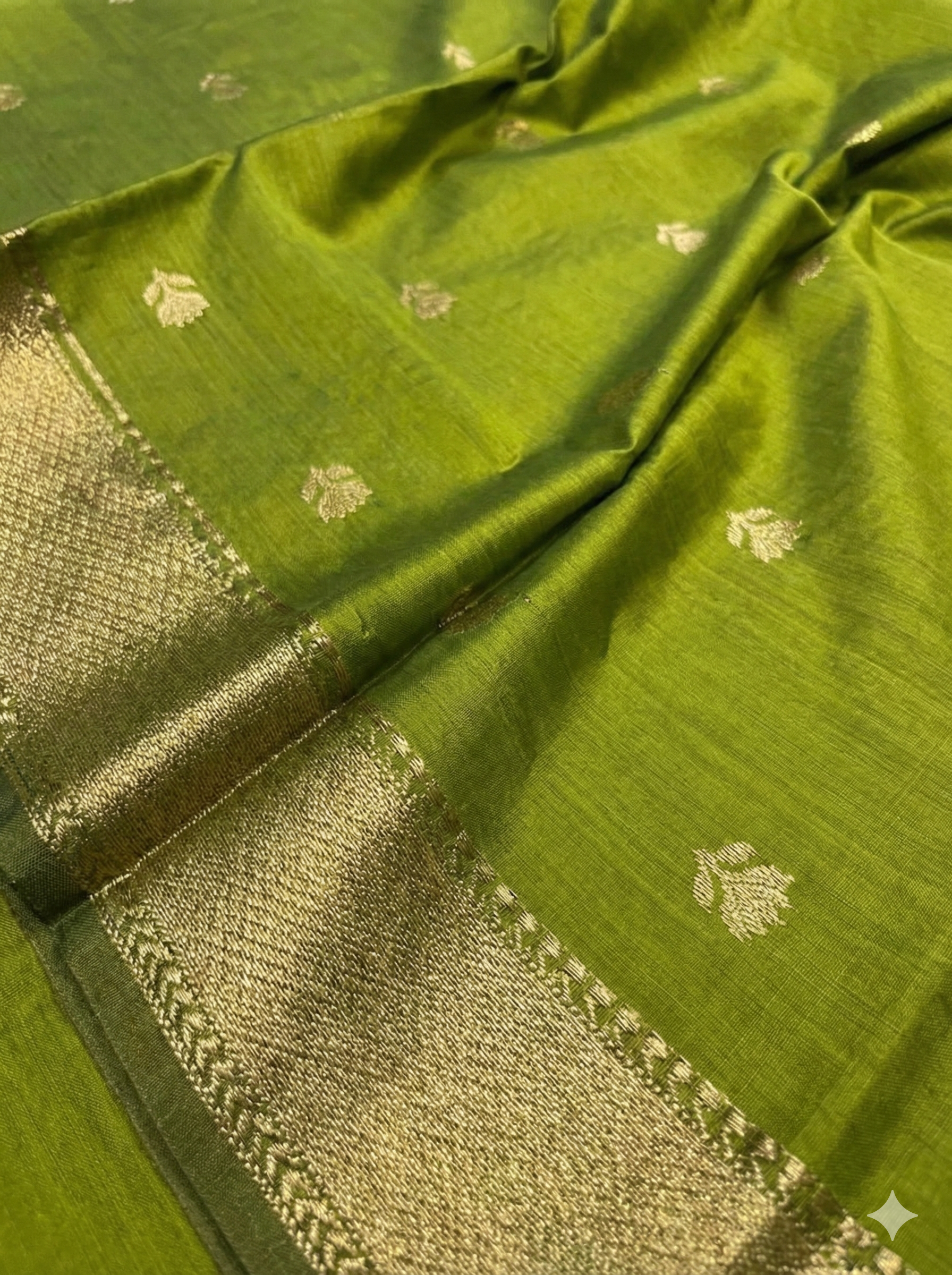 Bring home timeless elegance with this graceful Parrot Green Maheshwari Silk Cotton Saree, a beautiful tribute to India’s rich handloom tradition. Woven using the classic dobby technique, this saree features a vibrant parrot green body adorned with delicate lotus boota motifs, complemented by a soft golden zari border and an elegant pallu.