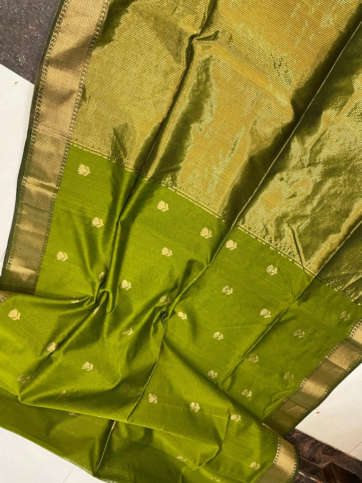 Handloom Authentic Parrot Green Maheshwari Silk Cotton Saree directly from weaver