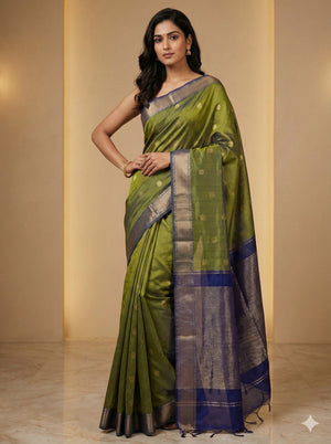 Elevate your ethnic wardrobe with this elegant Olive Green & Royal Blue Maheshwari Silk Cotton Saree, a beautiful representation of India’s rich handloom legacy. Woven using the traditional dobby technique, the saree features a serene olive green body embellished with delicate floral boota motifs, perfectly contrasted by a striking royal blue pallu and refined zari border.