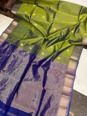 Handloom Authentic Olive Green & Royal Blue Maheshwari Silk Cotton Saree directly from weaver