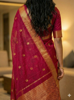 Step into timeless elegance with this exquisite Rani Pink Maheshwari Silk Cotton Saree, a classic handloom drape that celebrates India’s rich textile heritage. Woven using the traditional dobby technique, this saree features a vibrant rani pink body adorned with delicate lotus boota motifs, beautifully complemented by a rich zari border and an elegant pallu.