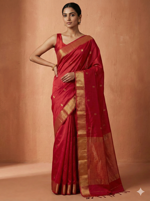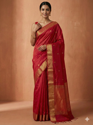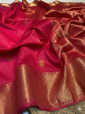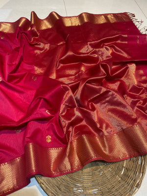 Handloom Exquisite Deep Pink Silk-Blend Maheshwari Silk Cotton Saree with Rich Golden Zari Work