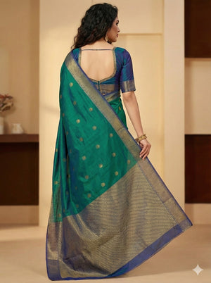 Embrace timeless elegance with this graceful Teal Green Maheshwari Silk Cotton Saree, a beautiful expression of India’s handloom heritage. Woven using the traditional dobby technique, this saree features a rich teal green body adorned with delicate lotus boota motifs, complemented by a refined steel blue pallu and a subtle zari border.