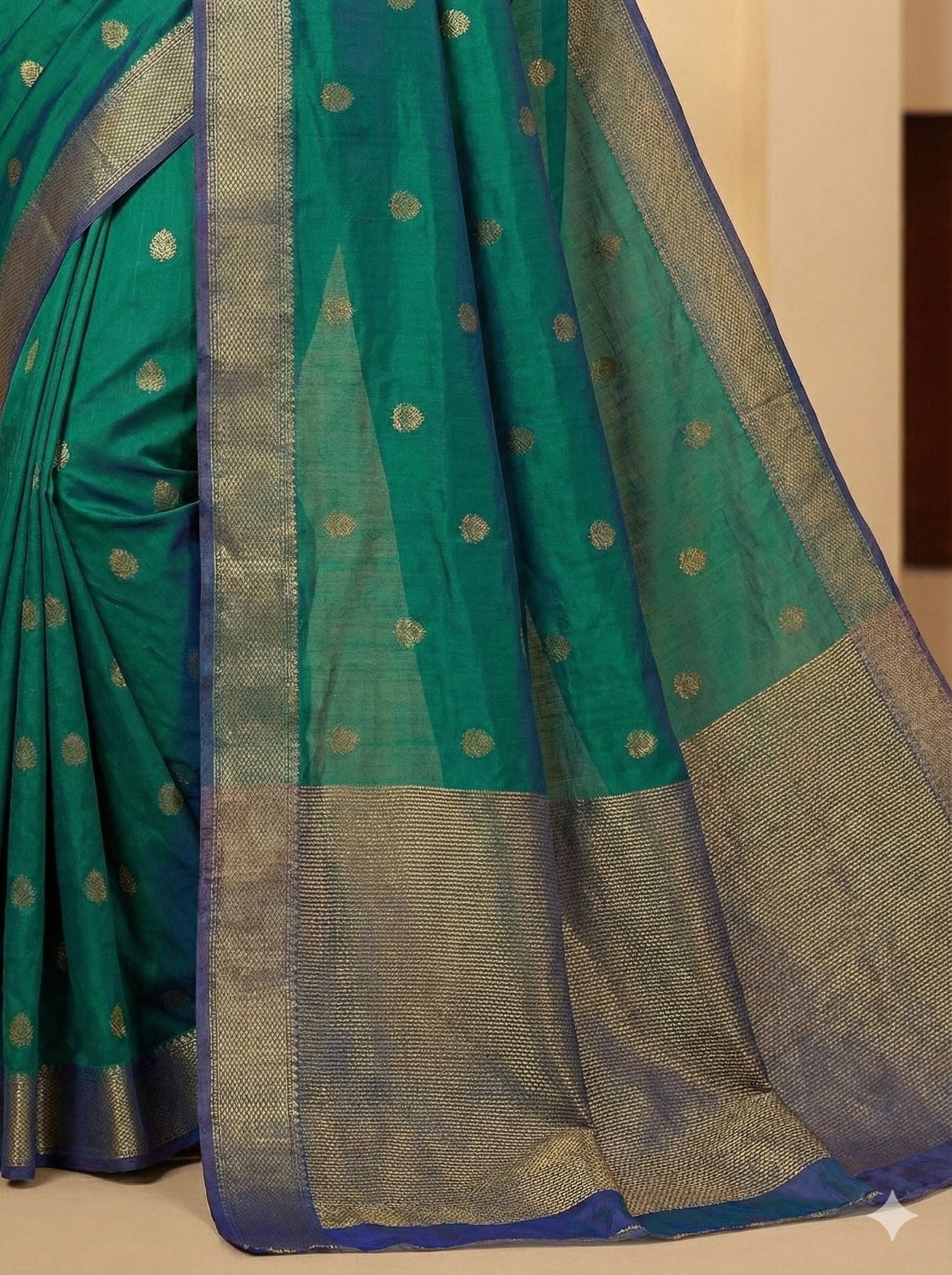 Handloom Teal Green Maheshwari Silk Cotton Saree with Lotus Boota & Zari Border – Traditional Dobby Weave