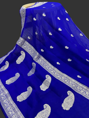 - Rich Royal blue base crafted in breathable khaddi chiffon silk