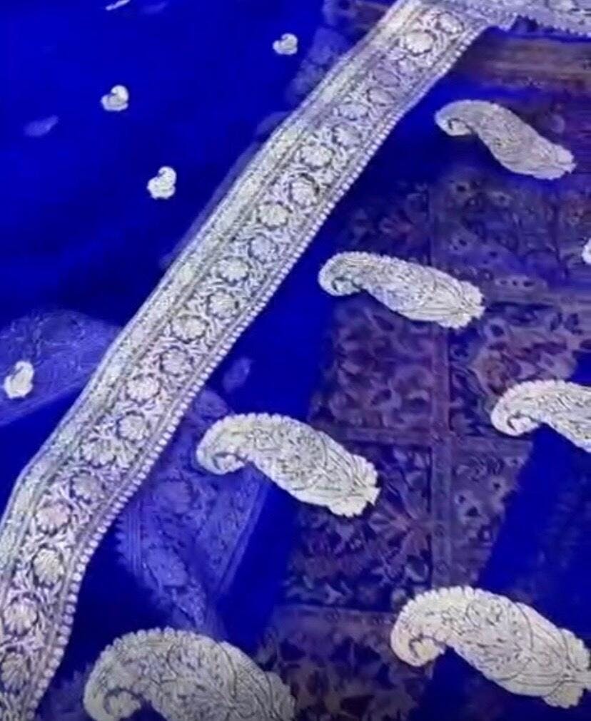 - Handloom Weaving: Skilled Banarasi artisans weave the fabric on handlooms, ensuring fluid drape and finesse.