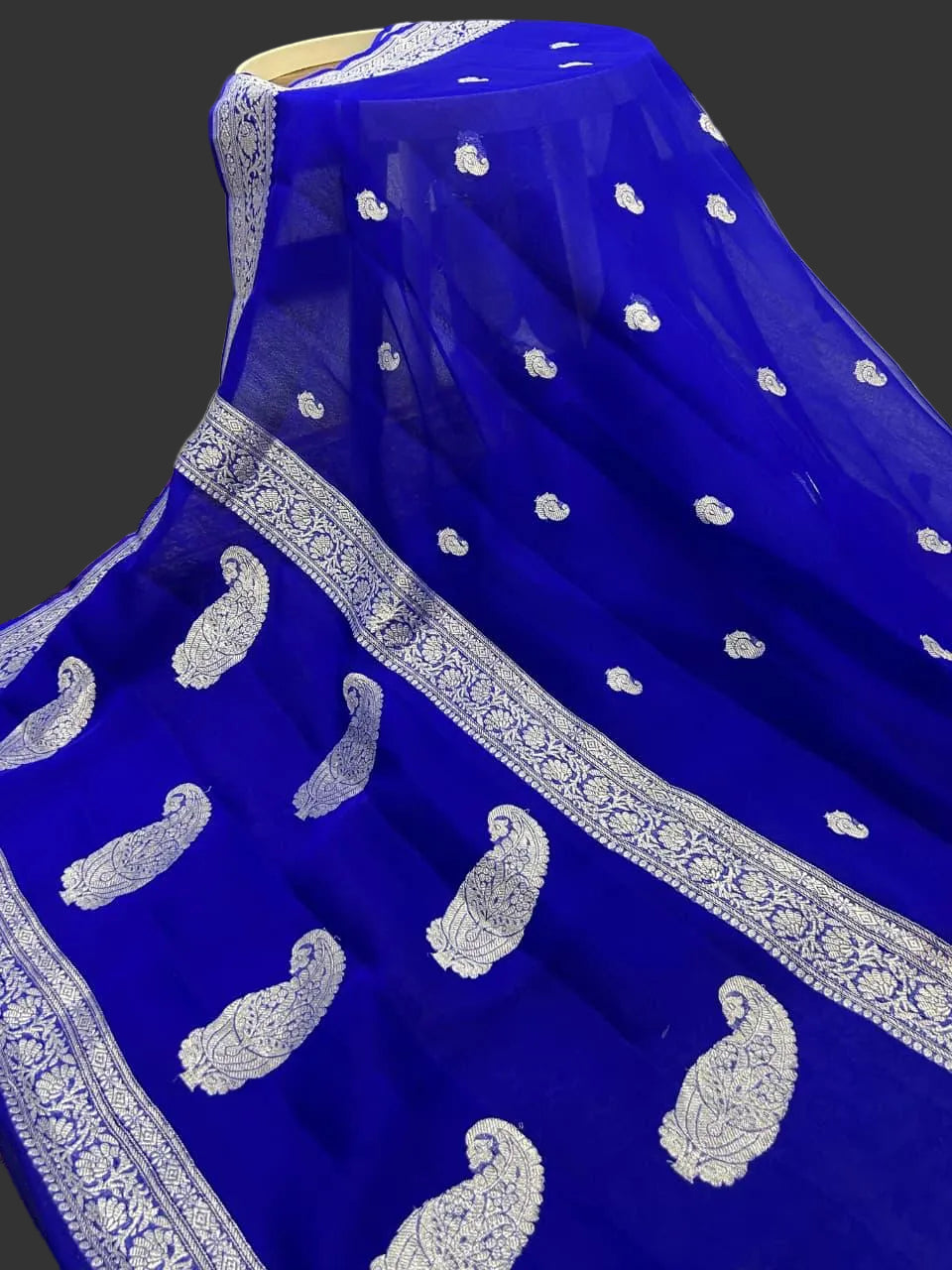 - Motif Creation: Traditional buttas and borders are woven using age‑old Banarasi techniques.
