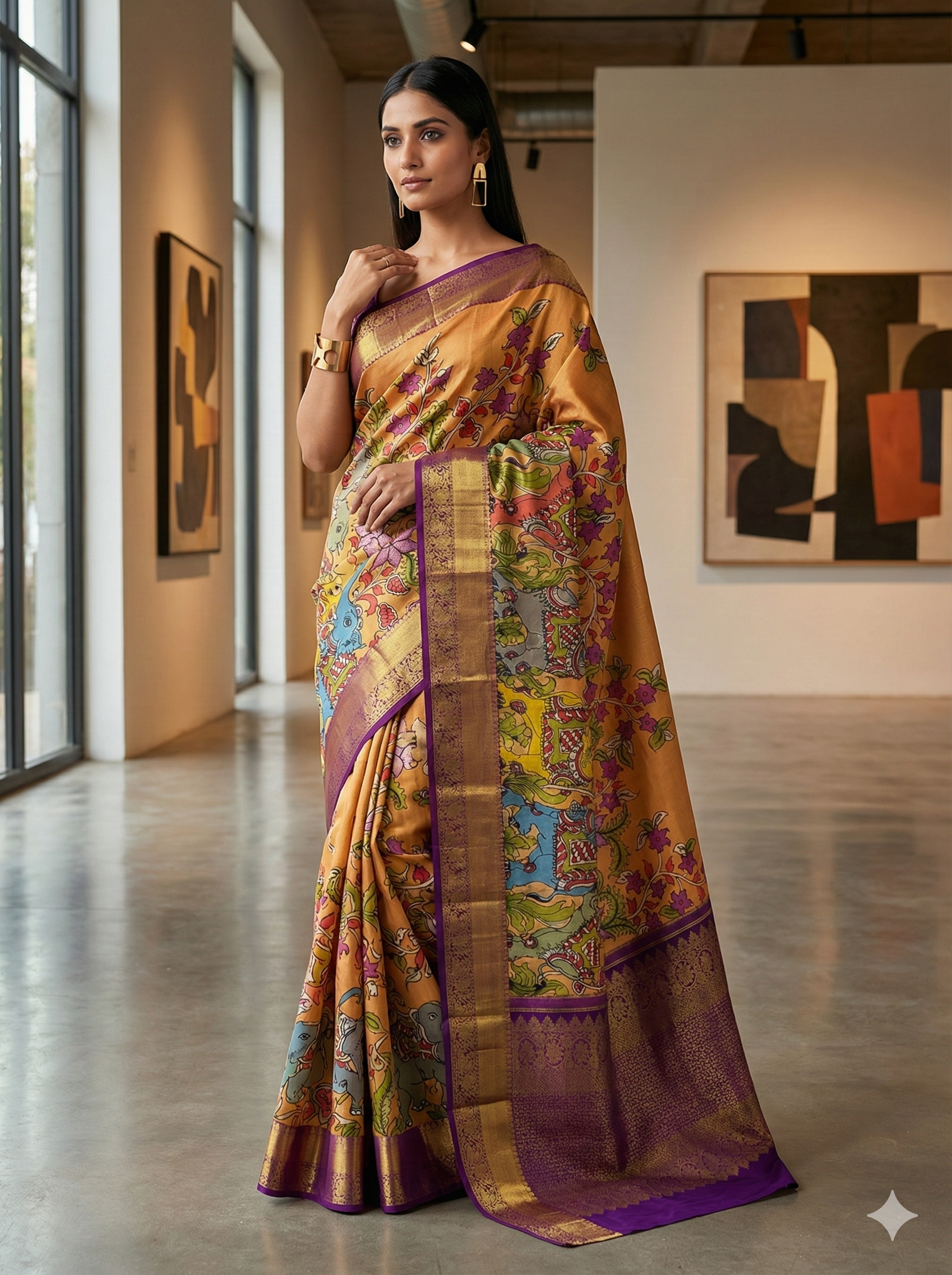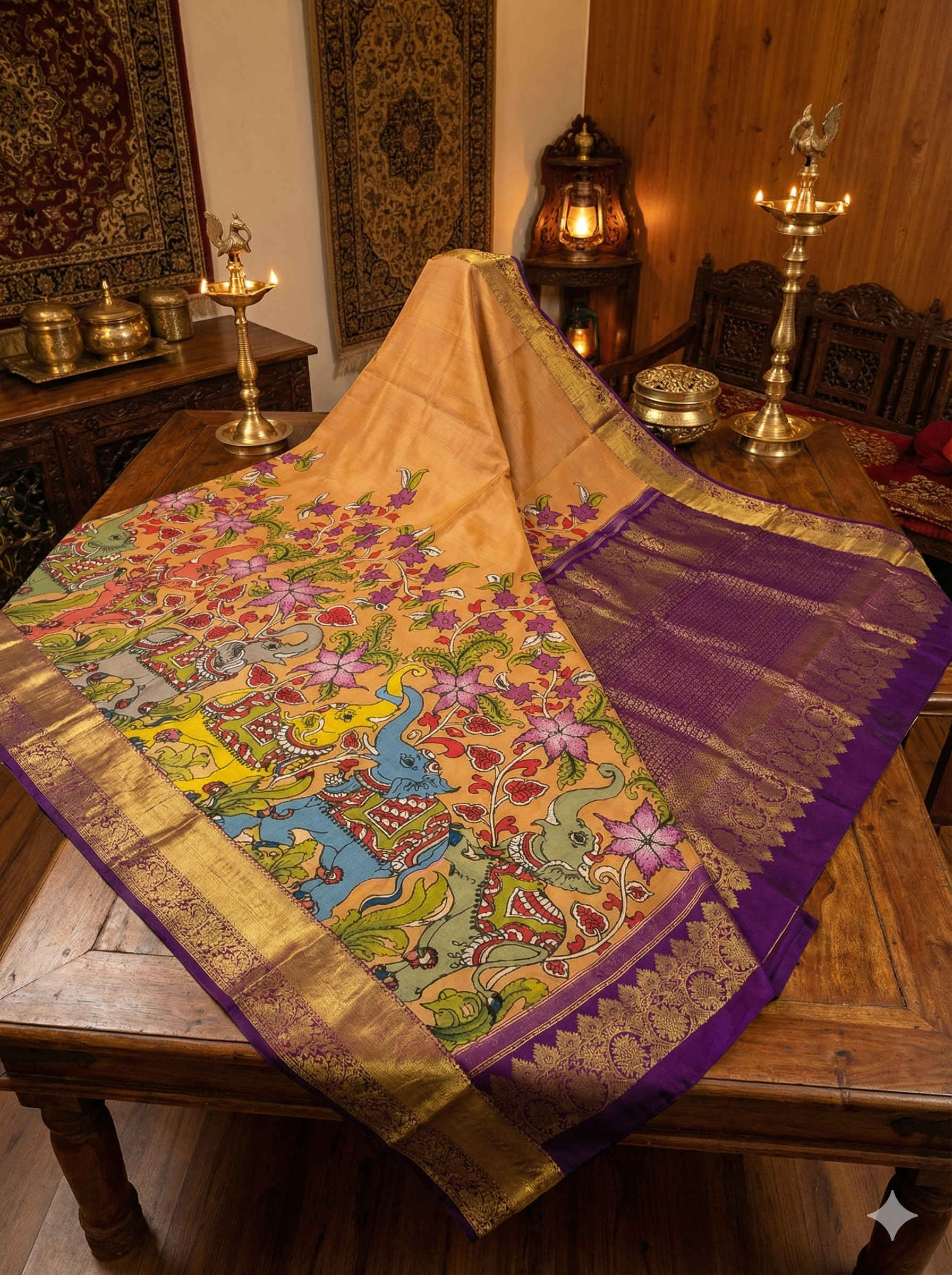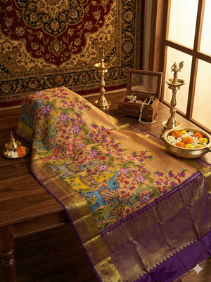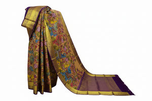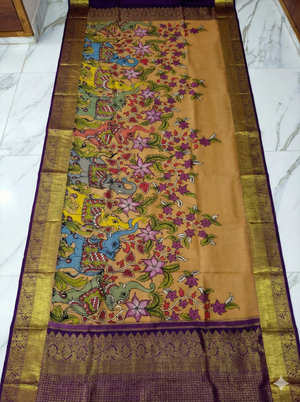 When Andhra’s Art meets Tamil Nadu’s Tradition. When Andhra’s Art meets Tamil Nadu’s Tradition. Celebrate heritage with this magnificent Mustard Yellow Kanjeevaram Silk Saree. The body is adorned with a highly auspicious Kalamkari Elephant (Gaja) procession, interwoven with vibrant floral creepers. A majestic Deep Purple border with rich Gold Zari bands frames the design, leading to a heavy brocade pallu. This saree is a symbol of royalty and prosperity, making it a perfect choice for weddings and religious ceremonies.