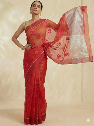 Chanderi sarees are renowned for their sheer texture, subtle shine, and lightweight drape. This is achieved through a unique combination of: