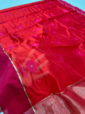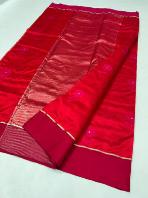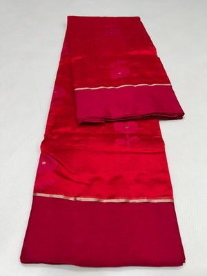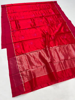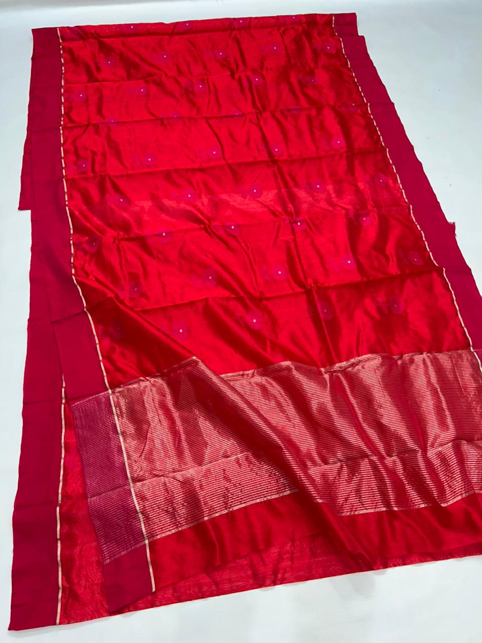 Premium Elegant Red Pattu Soft Silk Chanderi Saree with All-Over Meenakari Flower Butti & Rich Zari Pallu