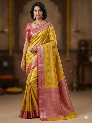 Embrace the timeless elegance of Indian heritage with this exquisite Chanderi handloom saree. Handwoven by skilled artisans, this saree is a masterpiece of traditional craftsmanship, crafted from luxurious Pattu Silk. The vibrant interplay of yellow and pink, combined with intricate Minakari weaving, makes it a perfect choice for weddings, festivals, and special occasions.
