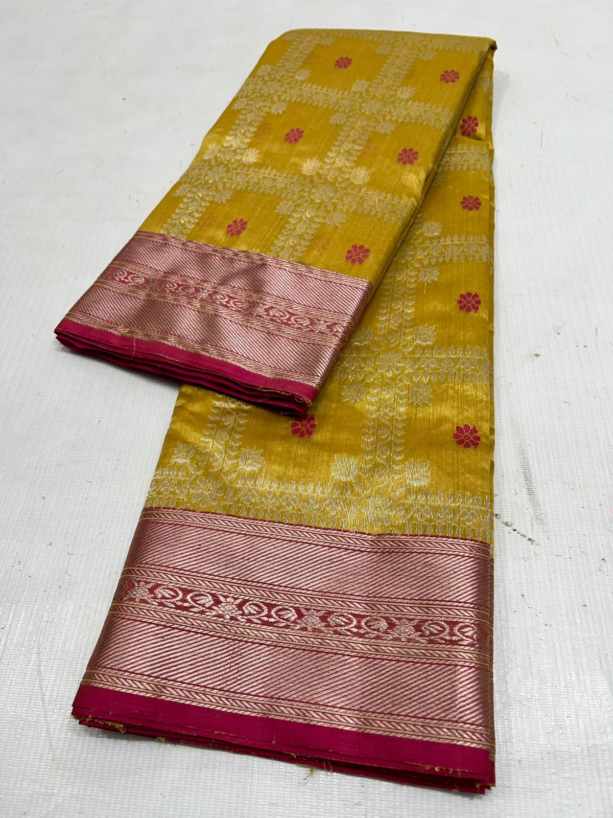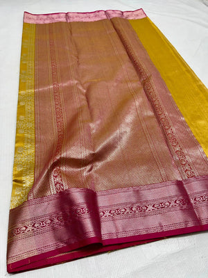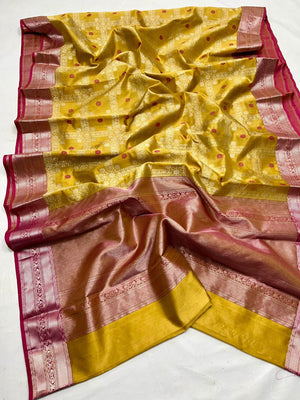 Premium Resplendent Chanderi Handloom Pattu Silk Saree in Yellow and Pink