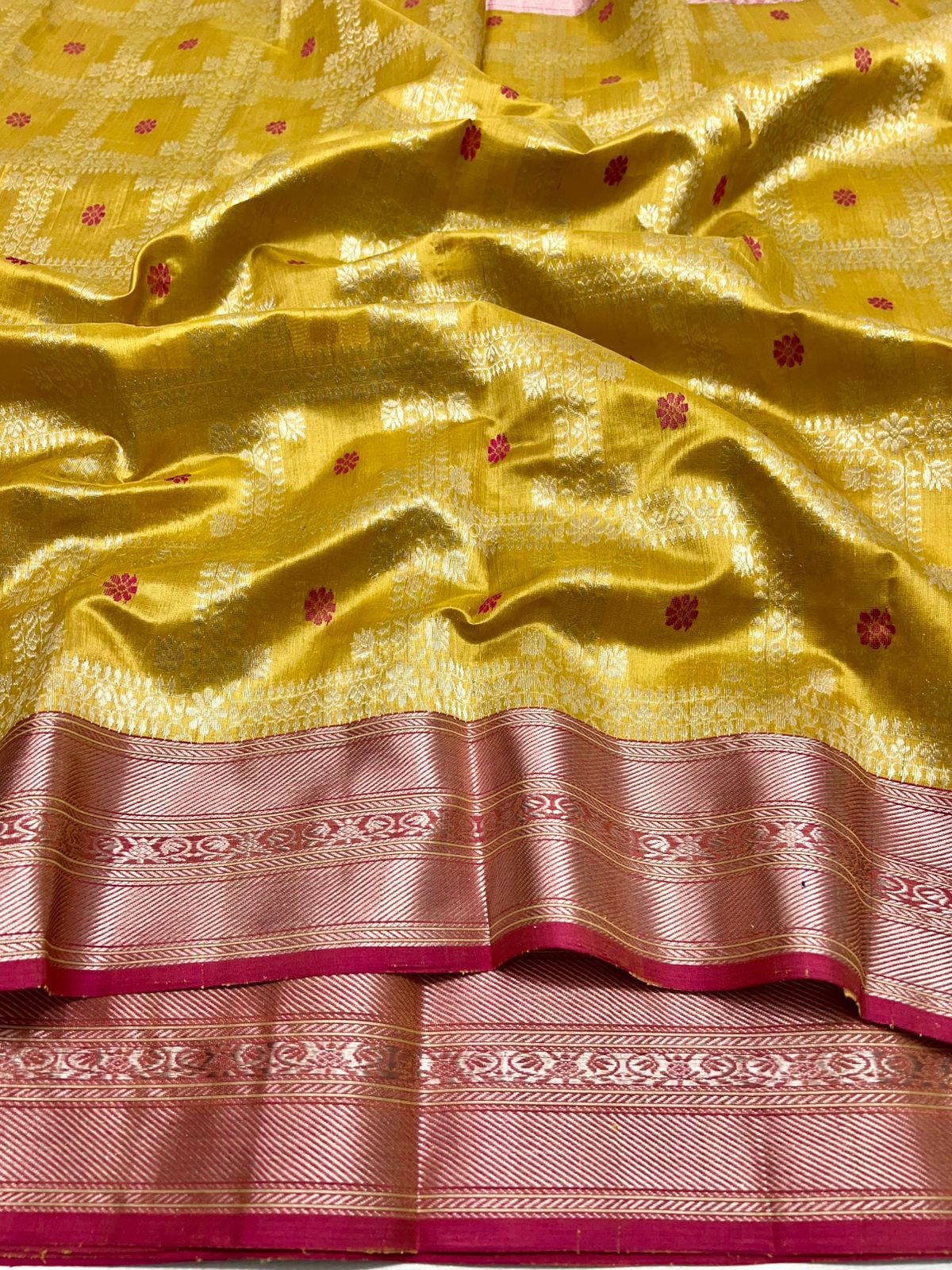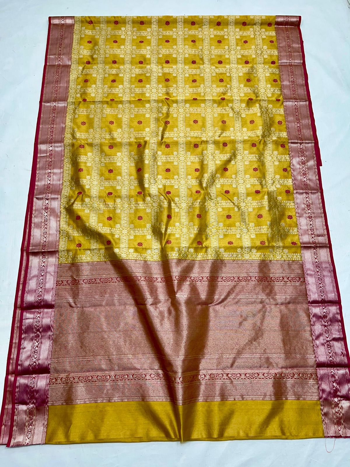 - Body: The main body of the saree is a radiant, sunny yellow. It is adorned with an intricate checkered pattern formed by fine gold zari lines. Nestled within each check is a delicate, small minakari floral buti. These motifs are woven using contrasting reddish-pink threads alongside the zari, creating the effect of precious enameling on the vibrant base.