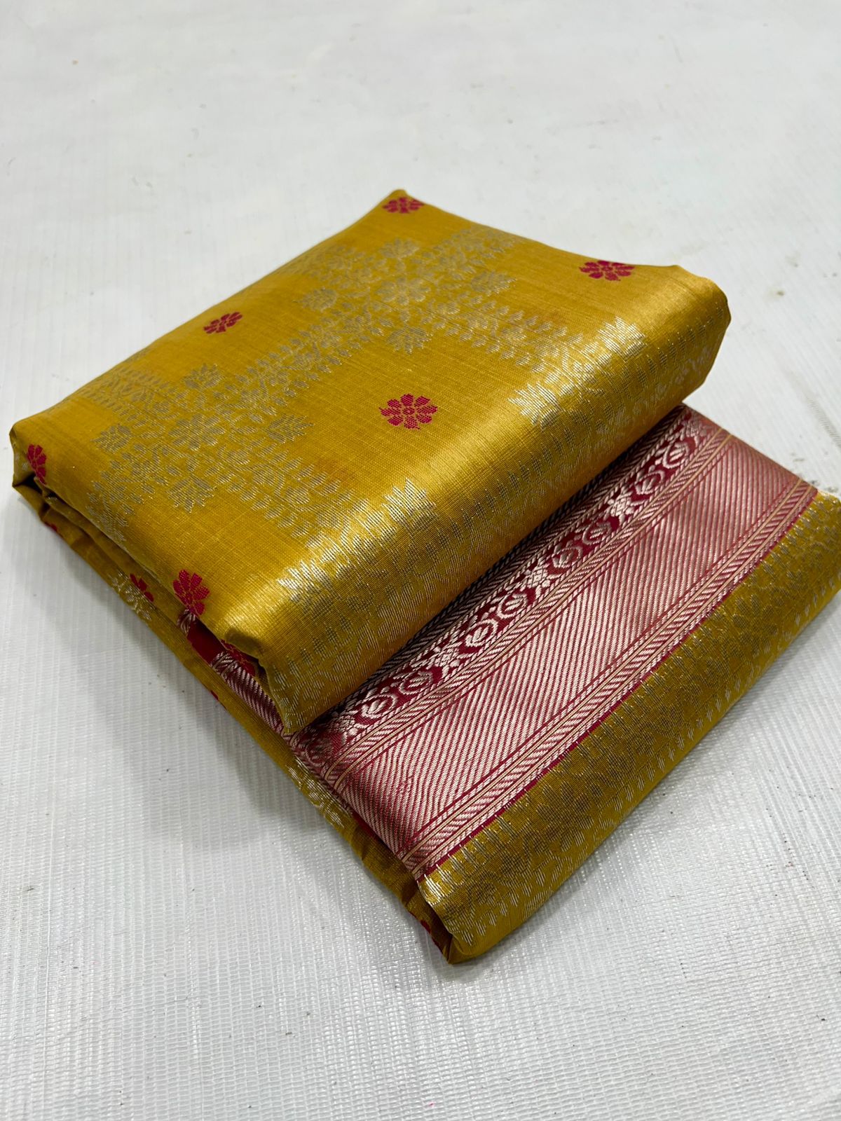 - Saree Color: Pure yellow & Gold Zari Checks with Reddish-Pink Minakari Floral