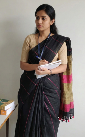 This saree is crafted from premium, breathable linen that drapes effortlessly, ensuring you stay cool and composed during high-pressure moments—be it a board meeting or a UPSC interview. The pallu features distinguished horizontal stripes in white and green, finished with playful yet elegant dual-tone tassels that add a hint of artisanal charm to the formal look.