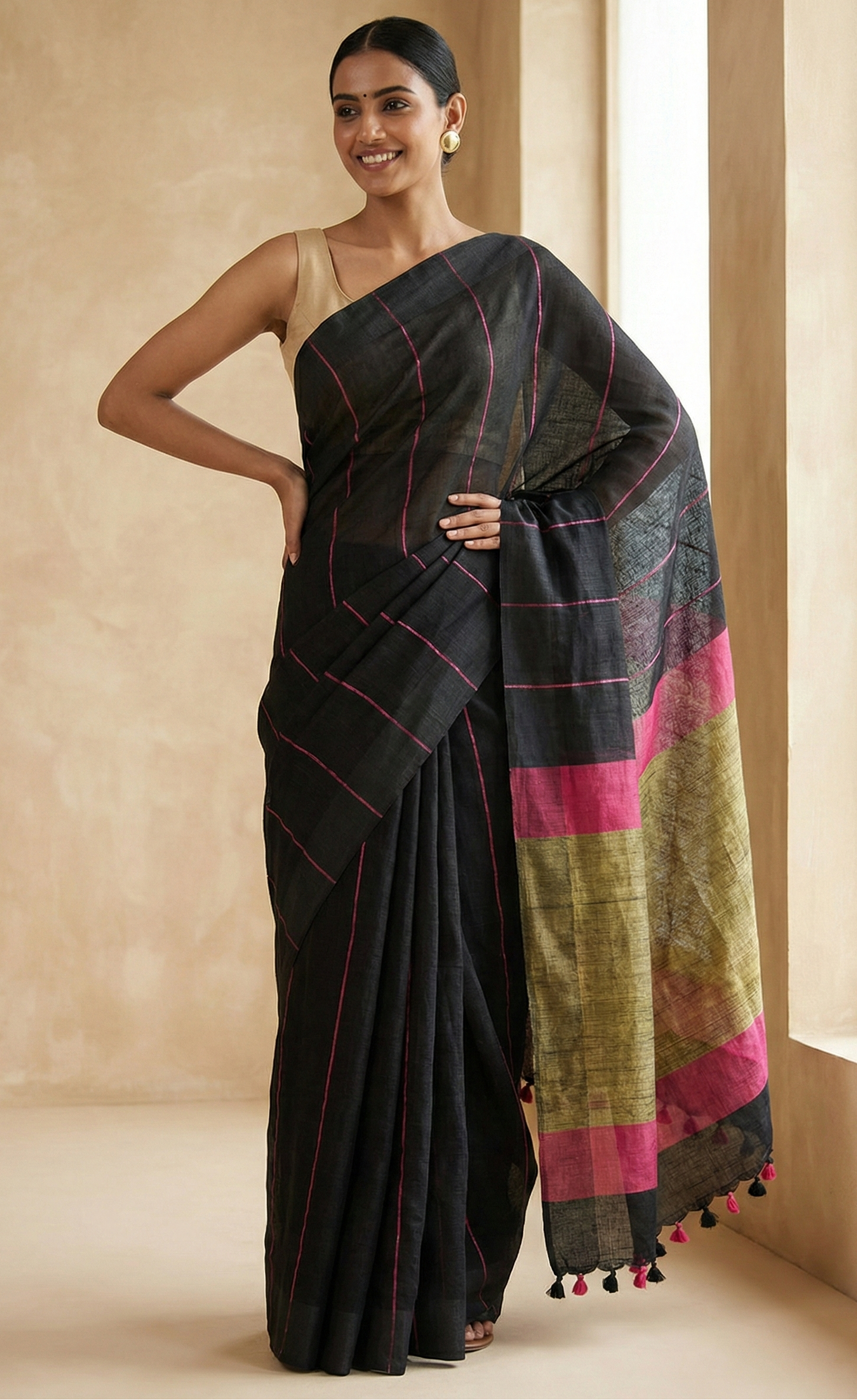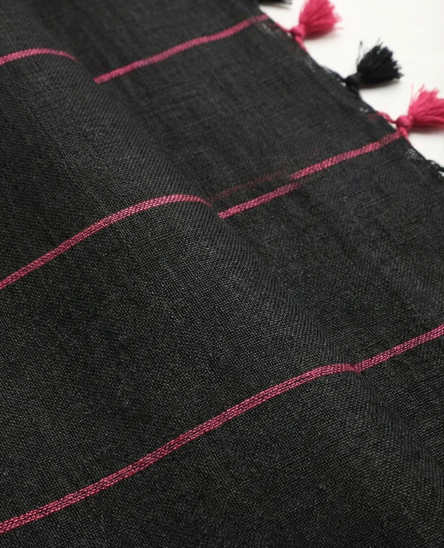 Pure Linen Saree in Balck with red thread lining & Tassels