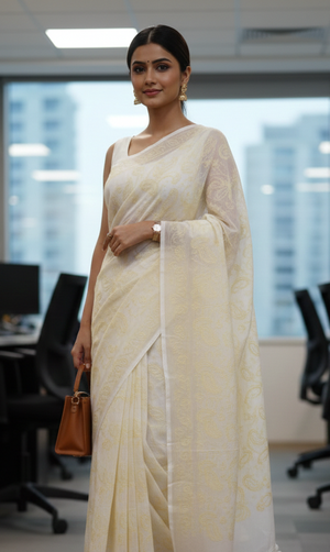 Elevate your professional wardrobe with this masterpiece of understated luxury. This vibrant white saree is meticulously crafted from Mul Cotton, a fabric celebrated for its ultra-soft texture, breathability, and lightweight feel—making it the ideal choice for long hours in a corporate environment. The saree features exquisite Chikankari hand-embroidery, showcasing traditional floral and paisley motifs that create a sophisticated, textured look. Its sheer yet durable weave offers a graceful drape that balances modern minimalism with heritage craftsmanship, ensuring you remain comfortable and poised from morning meetings to evening events.
