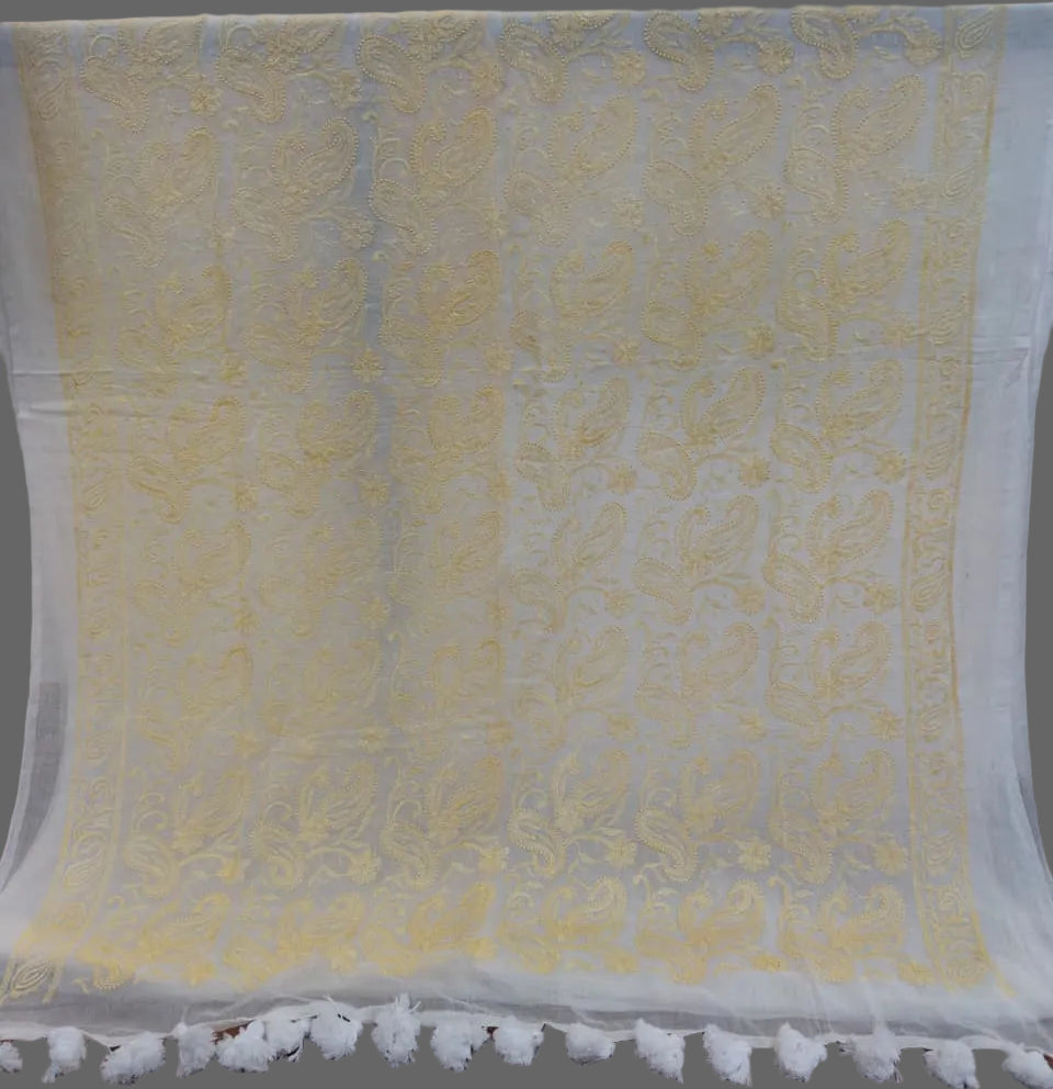 Hand-embroidered Chikankari featuring intricate paisley and floral patterns