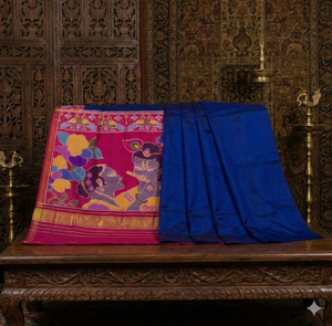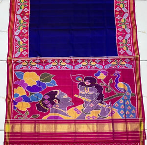 Royal Blue & Magenta - Handwoven Single Ikat Patola Silk Saree with Krishna Radha Motif