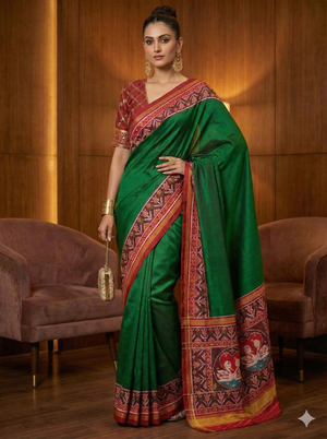 - Saree Color: Green body, Red pallu with multicolor motifs