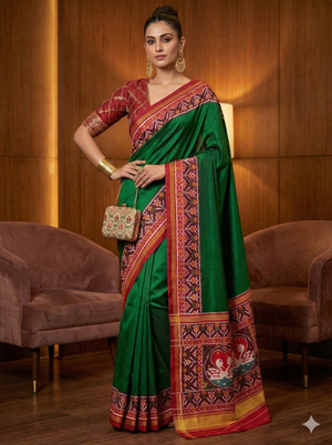This Patola silk saree is a stunning representation of Gujarat’s weaving heritage, known for its intricate ikat patterns and luxurious silk texture. The saree features: