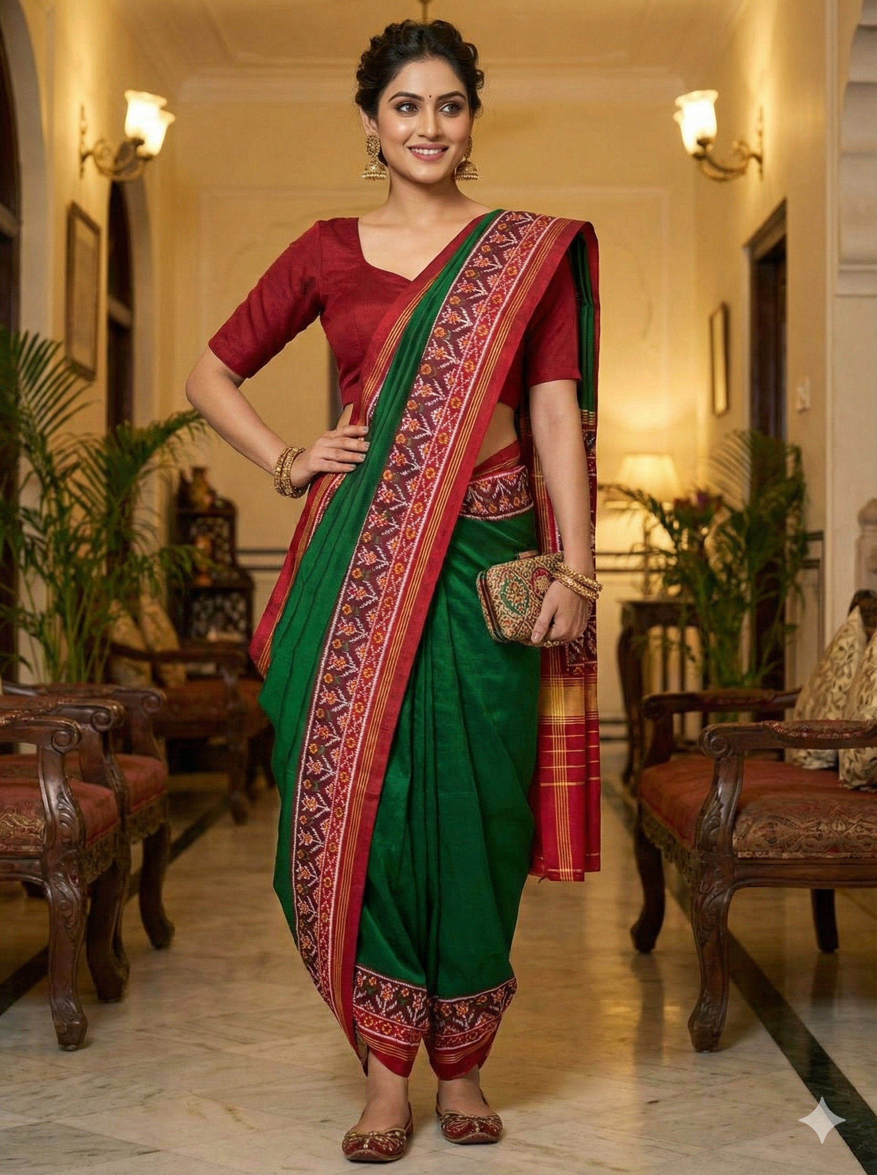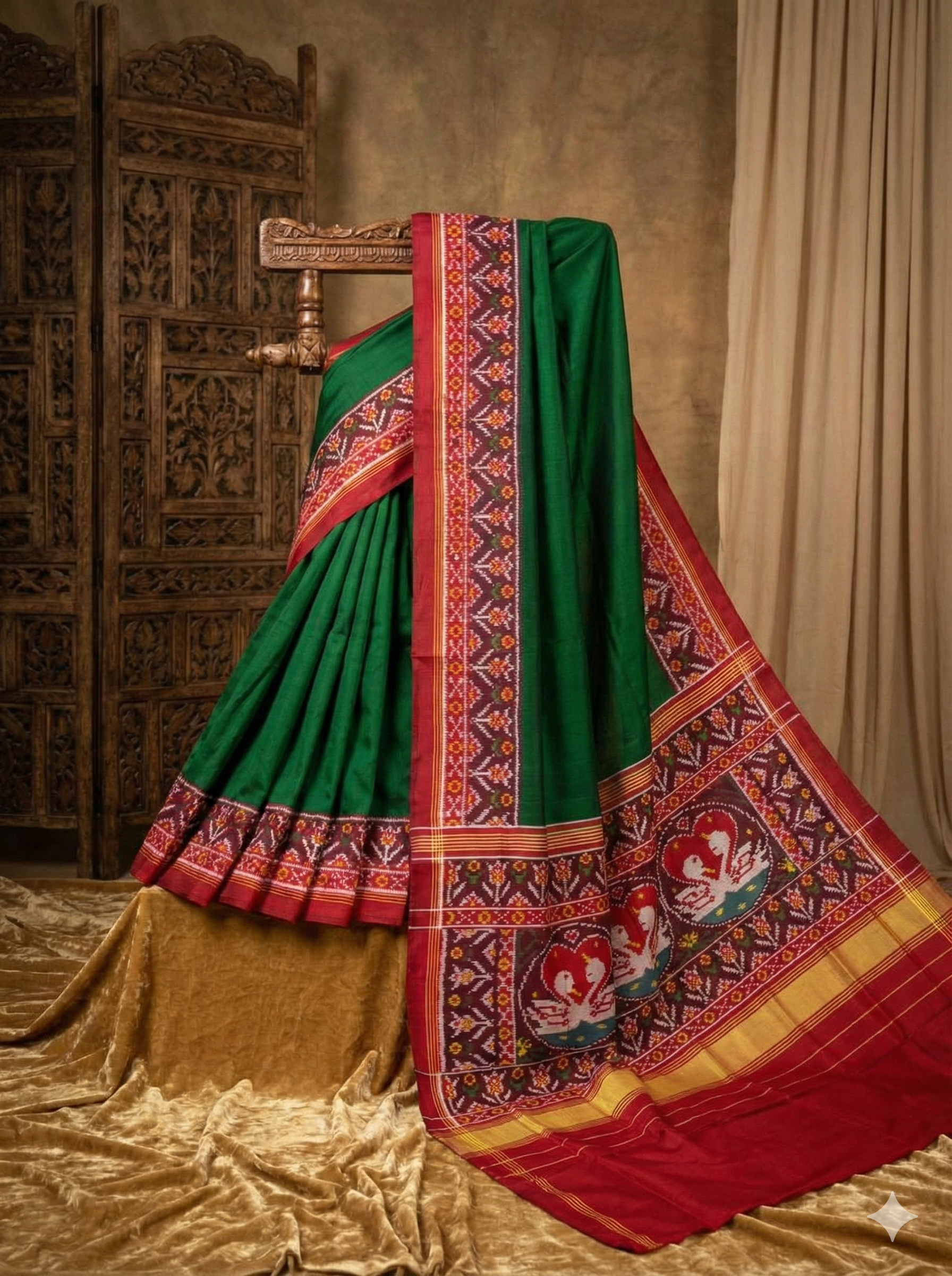 - Pallu: Vibrant red adorned with traditional swan motifs inside heart-shaped frames, symbolizing love and grace, along with geometric ikat designs.
