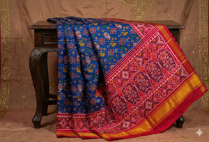 Patola sarees are one of India’s most exquisite and ancient handwoven textiles, originating from Patan, Gujarat. They are famous for their intricate geometric and floral patterns, vibrant colors, and the unique double ikat weaving technique, which is extremely rare and labor-intensive.