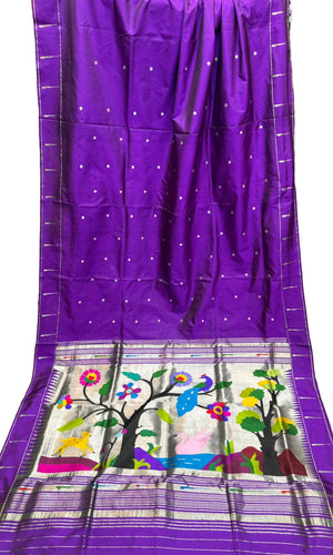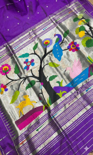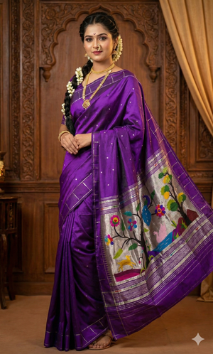 Deep Purple Handloom Pure Silk Paithani Saree with Rich Silver Zari Peacock & Tree of Life Pallu | Traditional Maharashtrian Wedding & Festive Wear