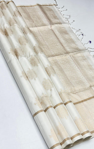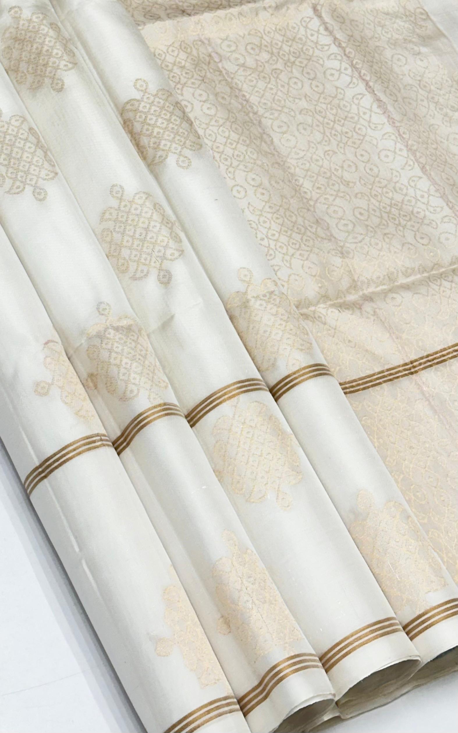 Off-white Soft Silk Handloom Saree with Koolam Putta Gold & Silver Zari