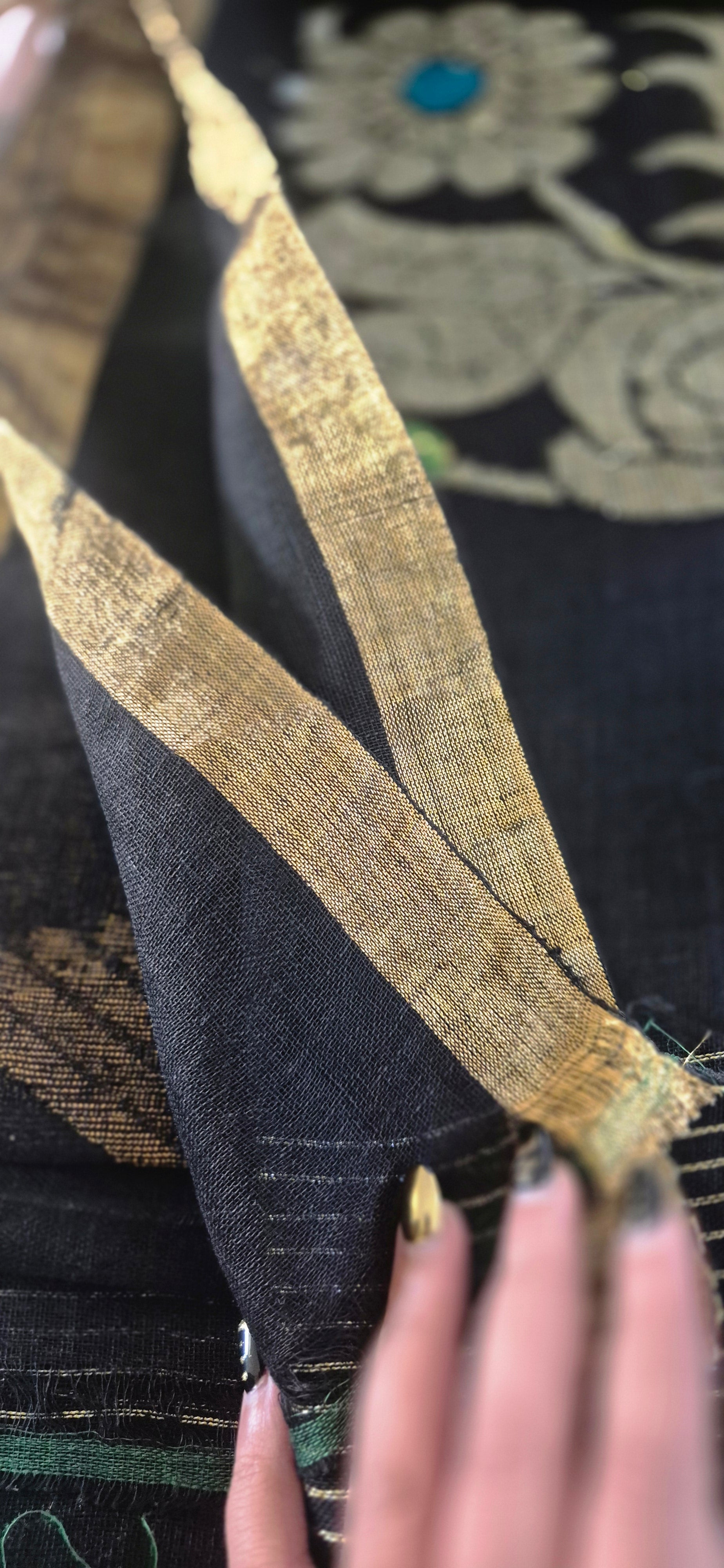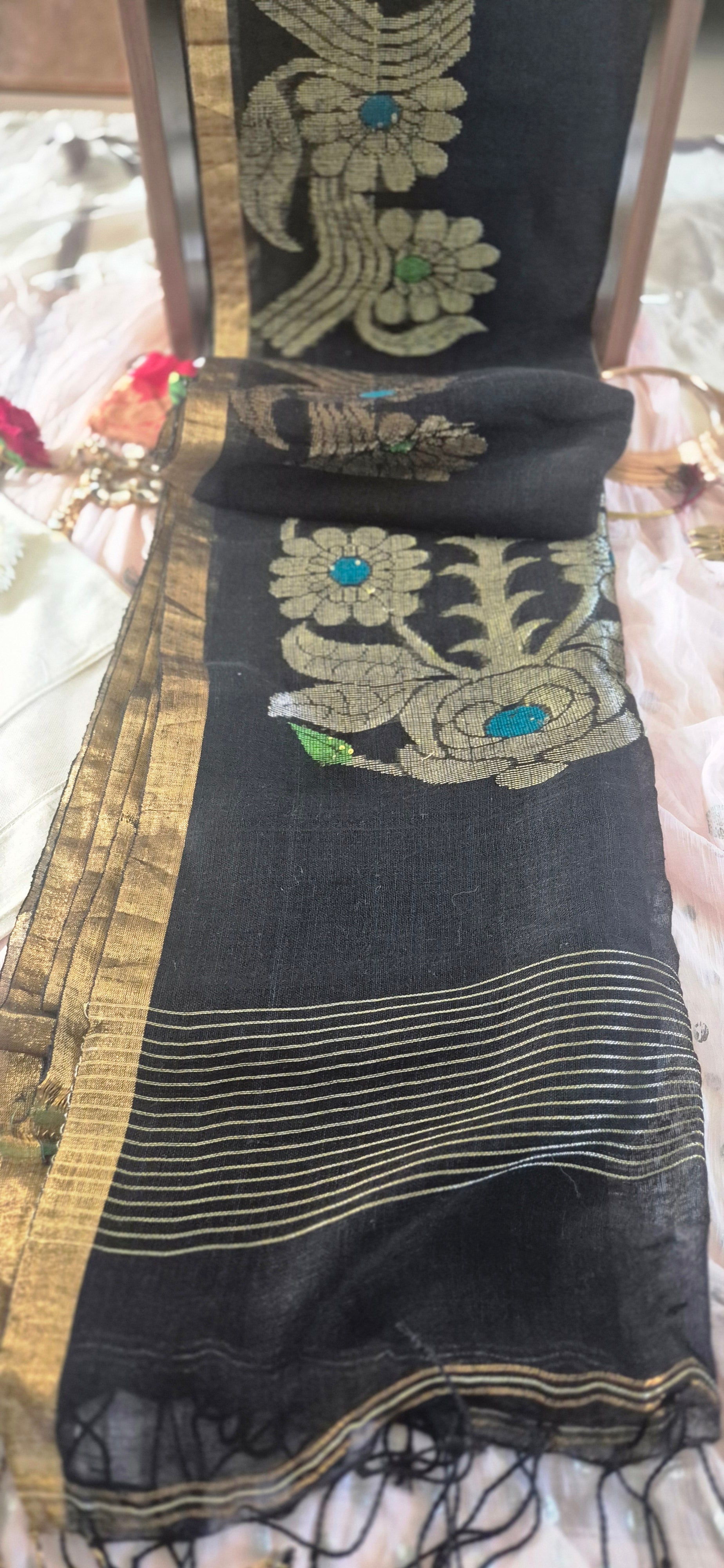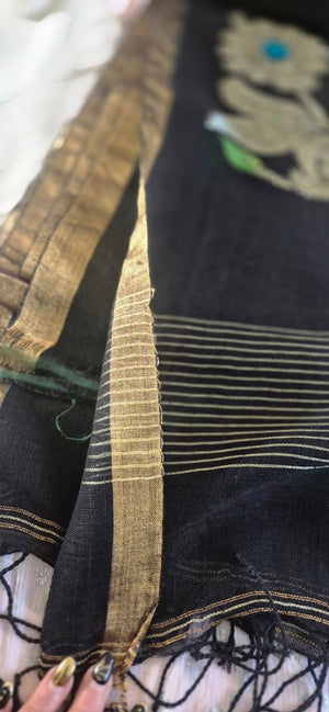Premium Black Linen Saree with Golden Zari Border | Designer Floral Weaves | Festive Collection
