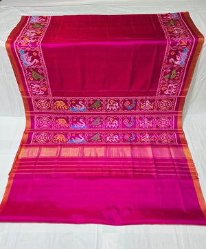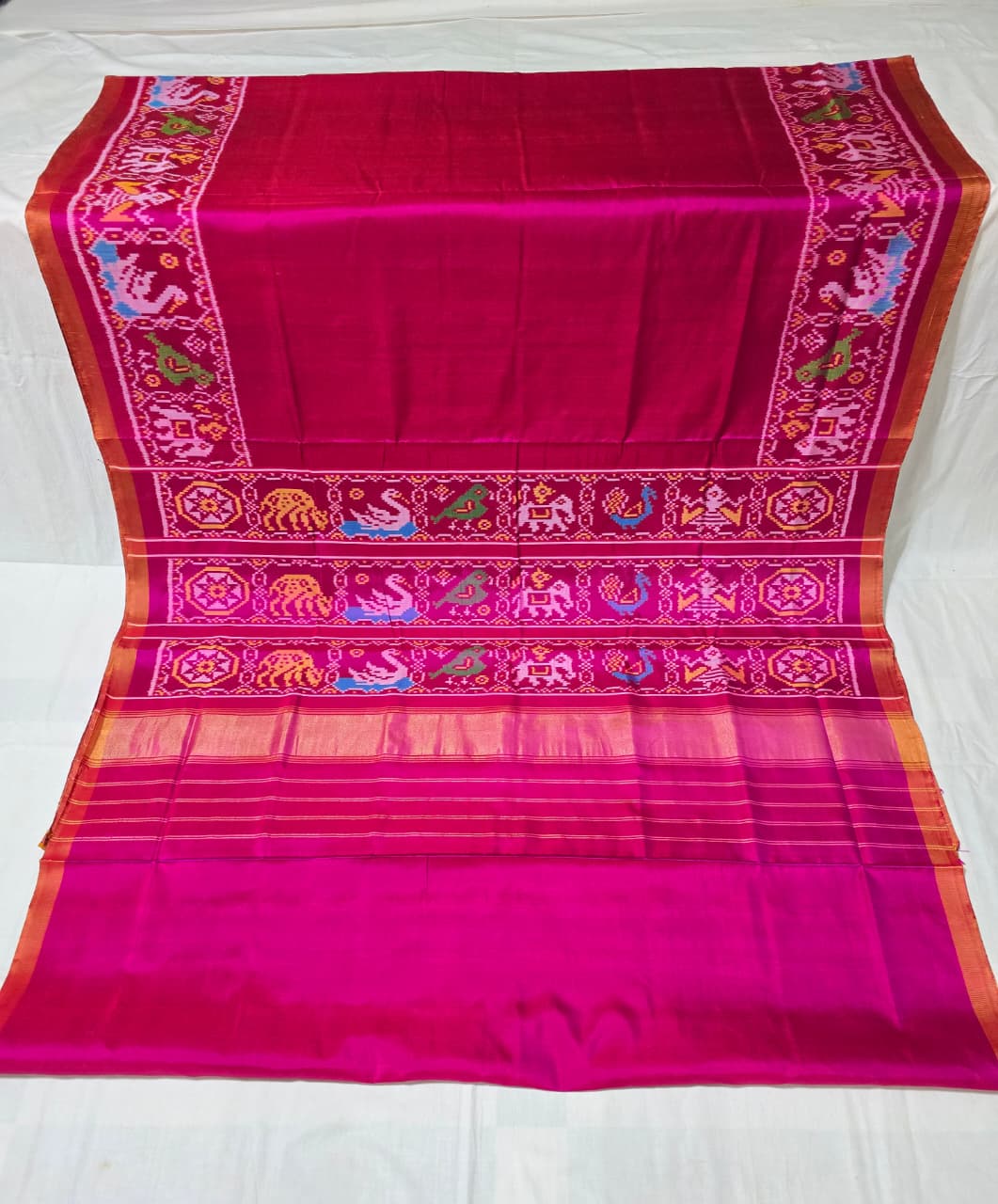 Hot Pink Semi Double Ikat Pure Silk Saree with Multicolor Animal Motifs and Rich Zari Border – Perfect for Weddings & Festive Wear